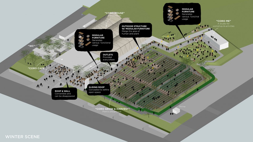人类与植物共享着这同一片小小的天地,灵活的设计让场地也可随需要拓展,举办不同类型的活动。从种植作物的需求出发,跨度1.5米的框架网格系统结构覆盖了整片场地,联系着或开放、或封闭的各类空间。结构、表皮、服务设施、空间格局等等结构系统相辅相成,划分出不同的功能区域