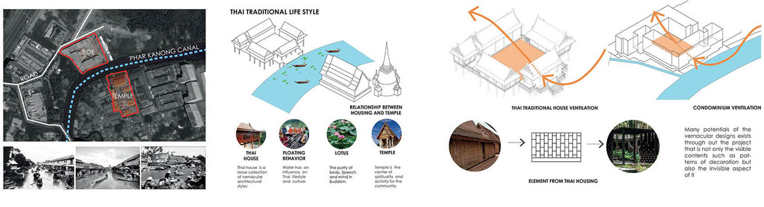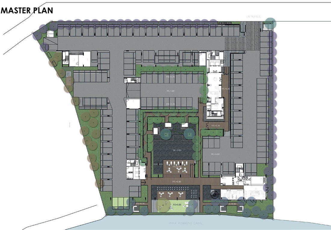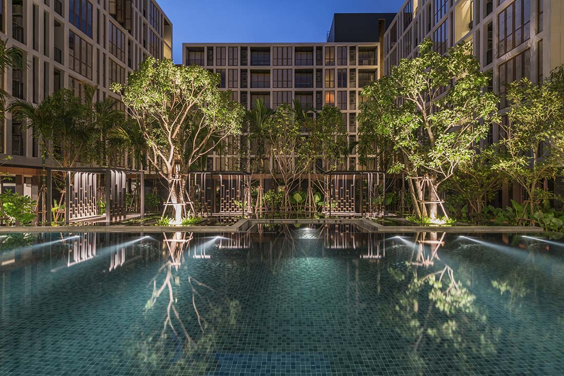 泰国的居住区通常由私有化的开发商投资建设,所以设法将建筑净面积最大化就成了严格的约束条件。建筑师与投资商双方都想沿着“Phra Khanong 运河”提升灵活开放空间,于是一个由住宅楼四面围合庭院的一体化“L 型街区”方案浮现出来。建筑师将所有的服务设施(如游泳池、花园、人造景观等)置于地面层,方便居住者及其街坊邻居在此处进行社交活动。