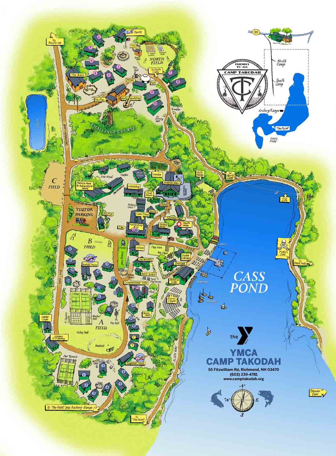 Takodah营地位于新罕布什尔州西南部的树林中,坐落在Cass Pond湖旁。营地拥有超过500英亩的风景秀丽的森林和田野,内设有迷人的小木屋,现代化的浴室和令人兴奋的活动区。