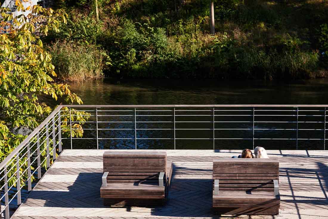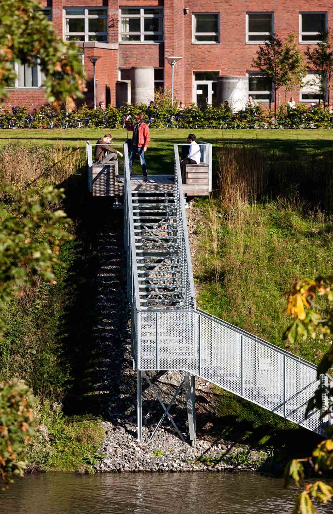 此次景观设计旨在实现水塘的多方位可达性,并为使用者带去更加亲密和有吸引力的社交环境。该景观设计包含两个部分:大水塘的西侧边缘为来访者带去驻足观景的公共空间,这里多设观景平台,平台浮于陡坡置入水塘之上;位于东侧的景观设计则恰好相反,这里栖息一条风雨走廊。一系列户外台阶在坡间迂回,或高耸,或直入水中。两侧景观采用完全不同的设计及建造材料。西侧景观多采用木板,三个露台分别以休息平台,绿廊和社交舞台为设计理念并命名。东侧采用钢板拉伸网建造的楼梯,映射了校园内的一些建筑造型。东侧造型较为轻盈,如同舞动在坡上的羊肠小径。而稳固坚挺的西侧景观则作为休息和社交的户外场所。