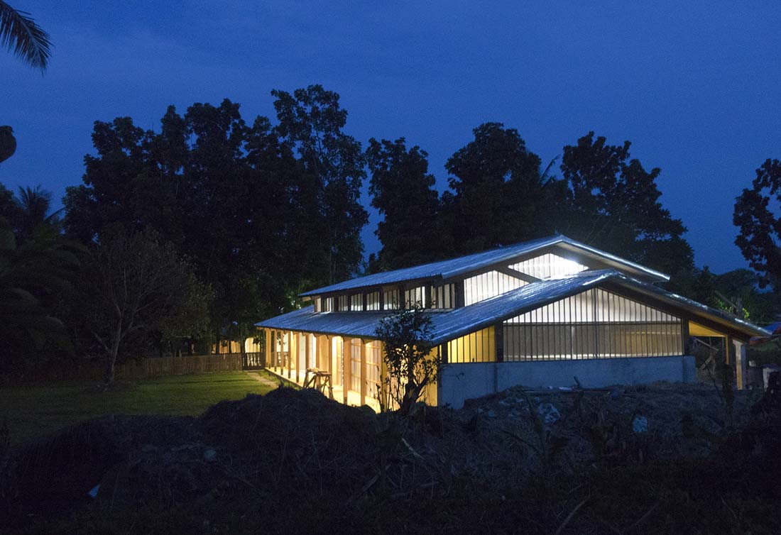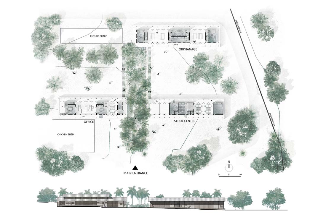 建筑物搭建在位于 Tagpuro 正中心的一块4公顷的场地上。场地内生长着为原有的家禽养殖场遮阴的椰子树和桃花心木,而养殖场已被台风损毁。这些树木存活了下来,用于引导主要的流线方向,以及作为私密空间与公共空间的分隔。沿着东西方向的轴线、朝向新的建筑物,利用树木增加了额外的遮阴,使得在热带环境中最小化热量的获取,并引导盛行风向的微风来提供一份惬意。