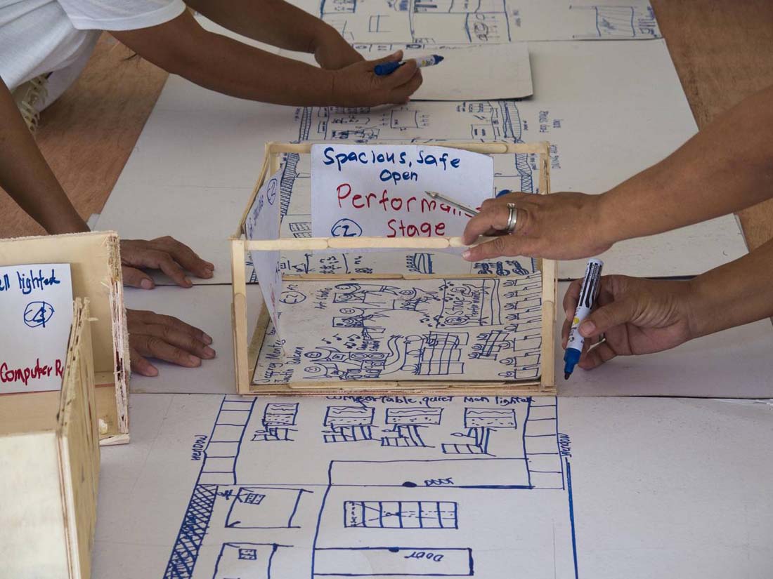 他们通过一系列全民参与性工作坊如手绘、诗歌、模型制作、绘制地图和物理搭建等形式为新基地添砖加瓦。鼓励参与者亲手搭建并主宰自己的共享社区。经过广泛的设计探讨,最终“开放与轻量”和“闭合与安宁”理念获得了社区民众的最广泛共鸣。因此,厚重的混凝土体块将用于在台风期间提供遮蔽,而通风的轻质木材结构将用于自然通风,并可以使强风通过建筑。