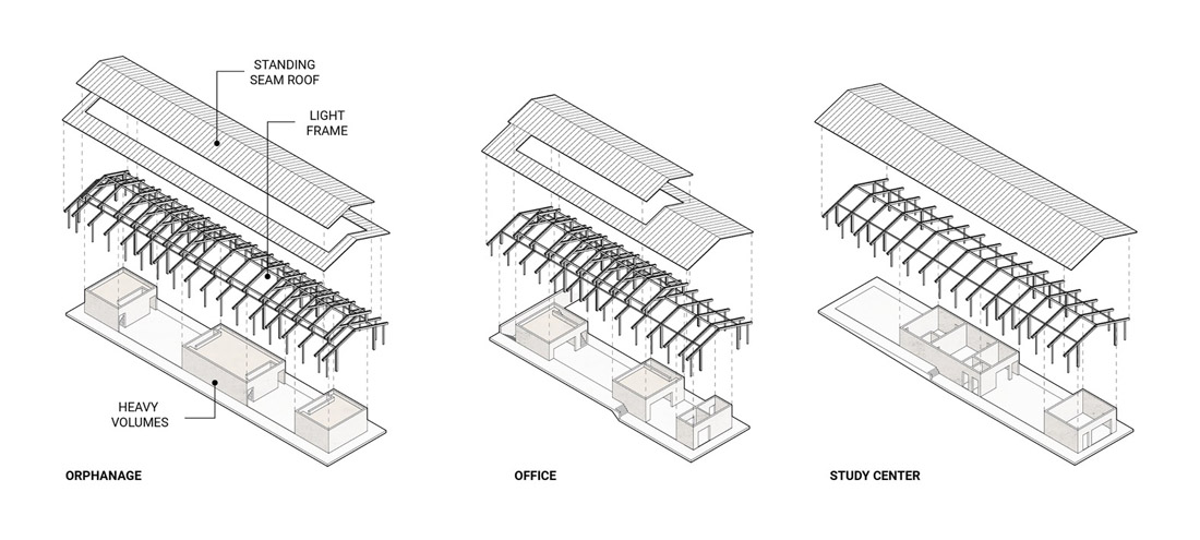 社区基地由三个上述的混凝土体块构成,容纳了位于第一层的厨房和厕所以及位于第二层的卧室。供白天使用的通风良好的娱乐活动空间位于体块之间。学习中心的体块中包含了音乐室、图书馆、厨房、厕所以及教师房间,体块之间为教室和用于唱歌、舞蹈、剧场的空间。Streetlight 组织的工作室也作为就业训练中心使用,包含三个容纳会议室、厕所以及一个管理员办公室的体块,并在开放空间中设置共享工作空间。