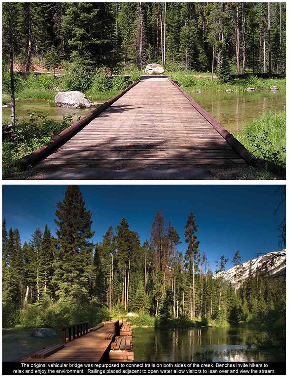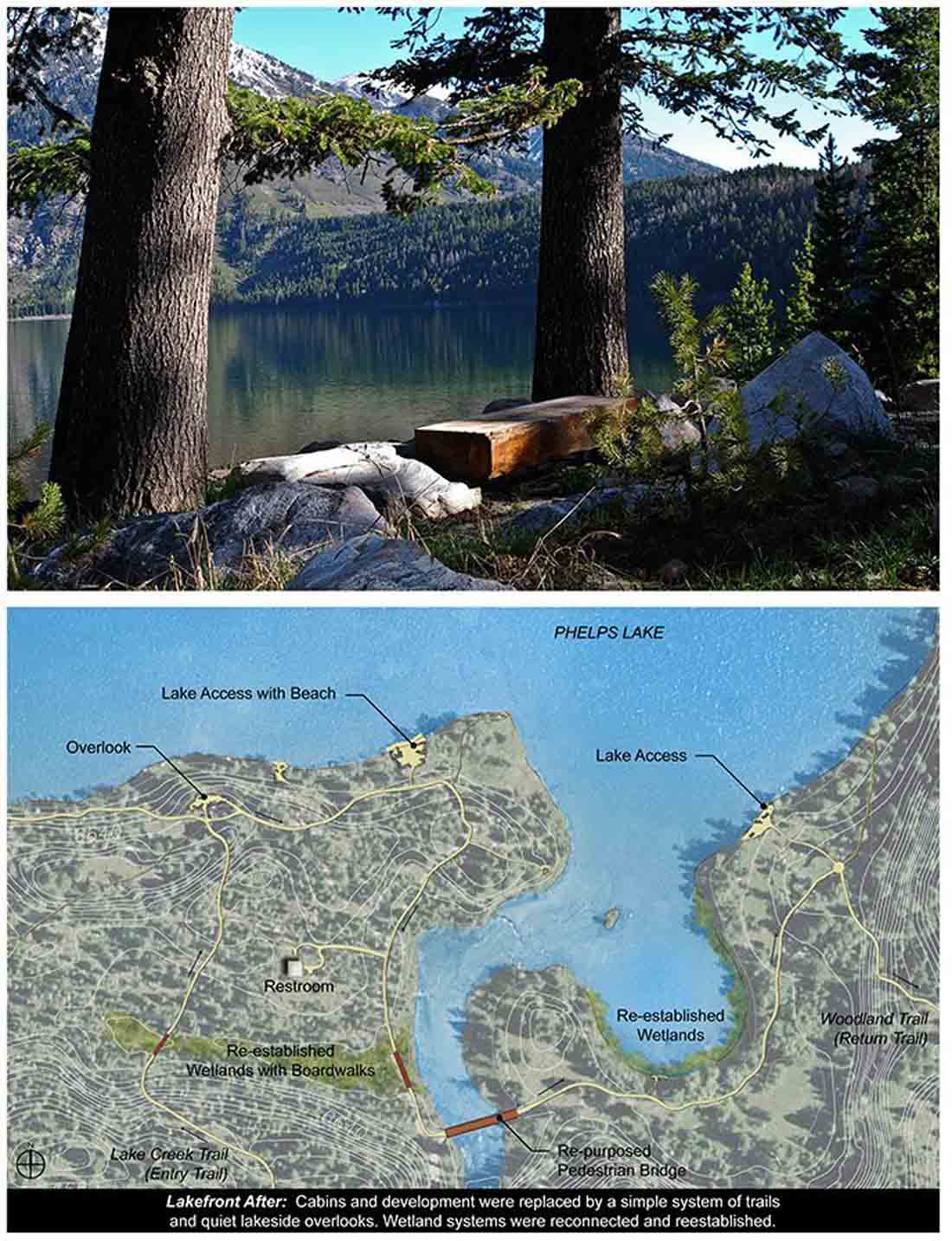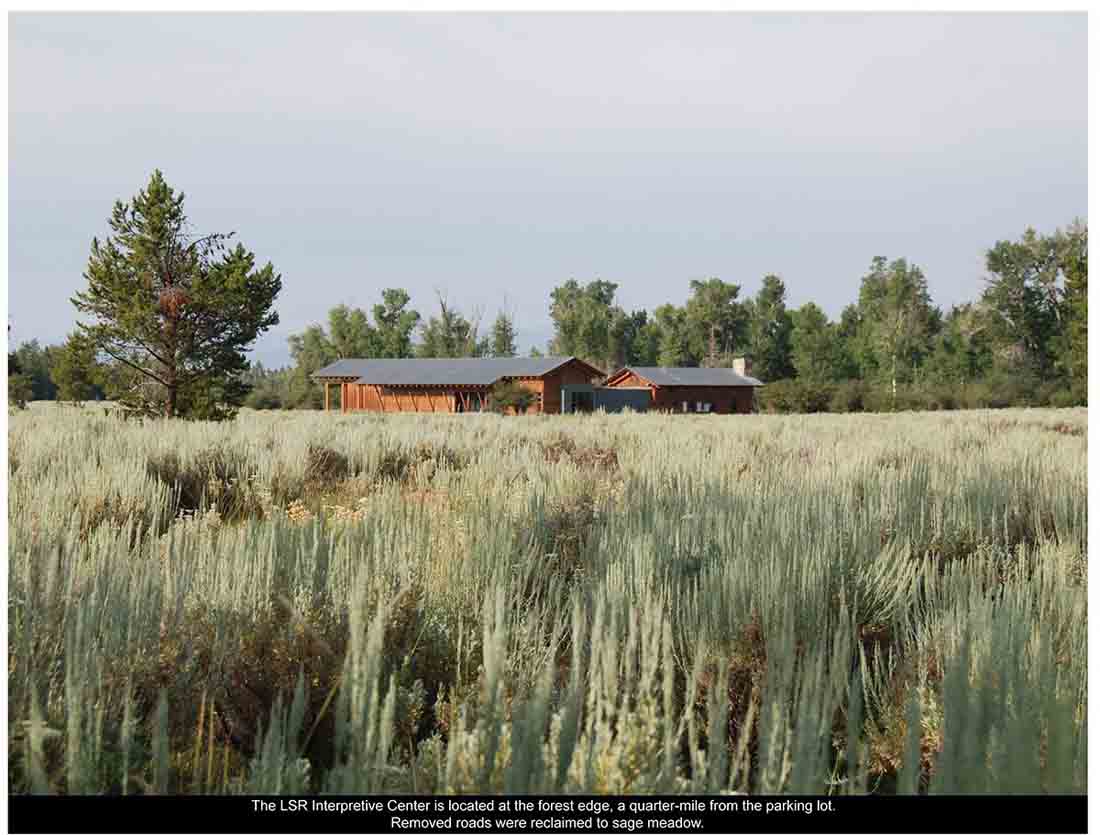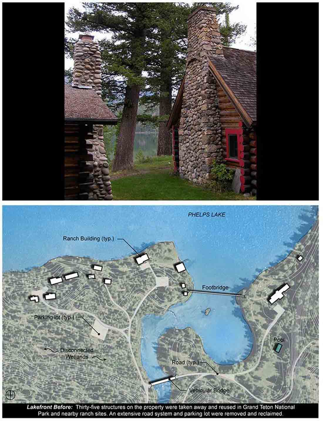 ▽ 改造前的湖畔:景点中有35处结构被移除,并且在大提顿国家公园以及附近的农场进行了重新使用。移除并重整了大量的道路系统以及停车场