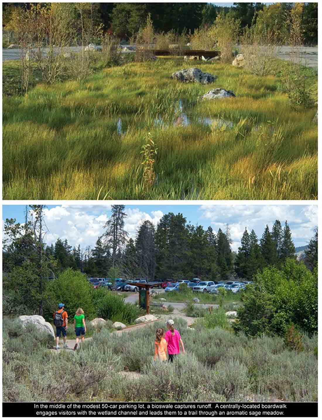 ▽ 在仅仅能够容纳50辆车的停车场中央,设有一个生物洼地收集径流。一条位于中央位置的木板人行道使得访客得以进入湿地中的路径,并且将他们引导至一条穿过芳香四溢的鼠尾草草甸的路径处
