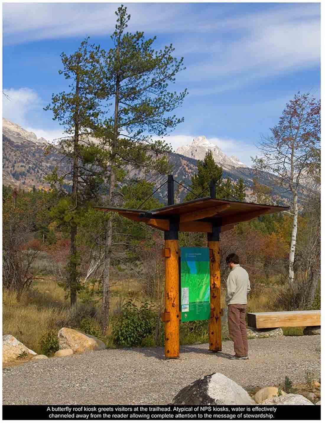 ▽ 蝶式屋顶亭在步道口与游客们亲切地打招呼。非典型的NPS凉亭,提供的水源位于远离读者的位置,使得公众得以完全注意到环境保护的信息