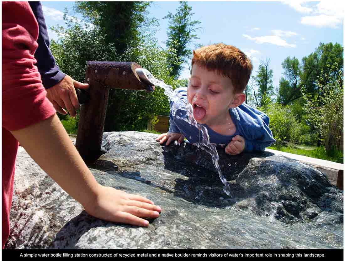 ▽ 一个简单的水平即填充了采用回收金属建造的小站,而一块当地的巨石则使得访客们回想起水资源在形成此地景观的重要作用