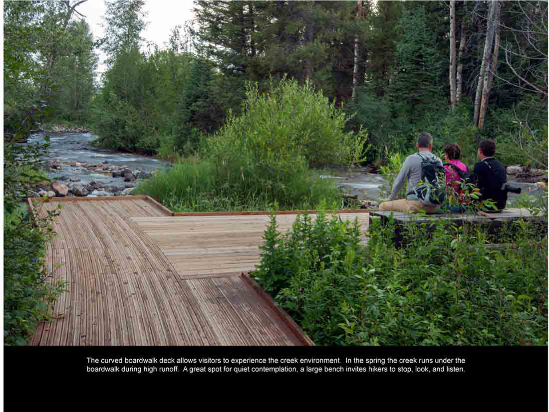 ▽ 弯曲的木板人行道平台使得访客得以体验溪流的环境。在春天,溪流在高径流期间奔流于木板人行道之下。静思默想的绝妙地点,大型的平台邀请访客们驻足观赏并且聆听