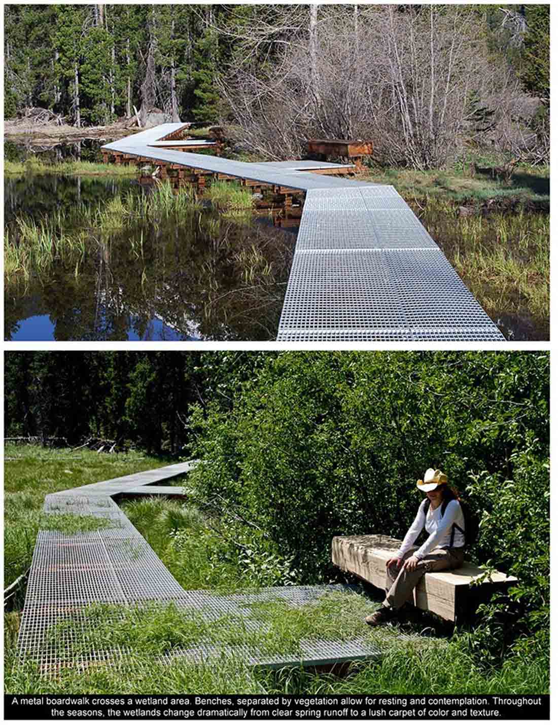 ▽ 穿越湿地区域的金属步道。长椅由植被分隔,可供人休憩及思考。随着季节的改变,湿地发生了奇妙的变化,从清泉径流变成了色彩及纹理交织的草甸地毯