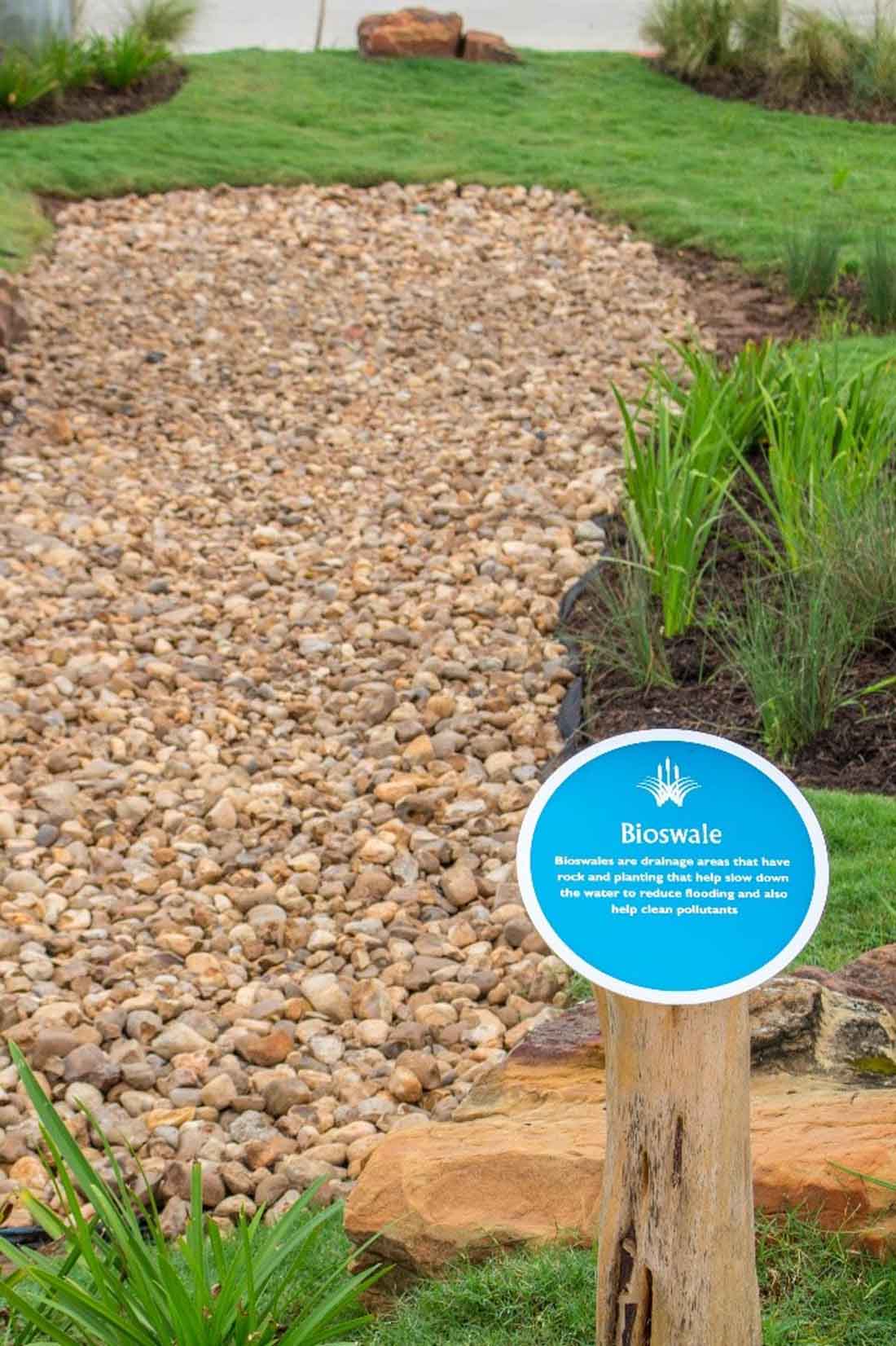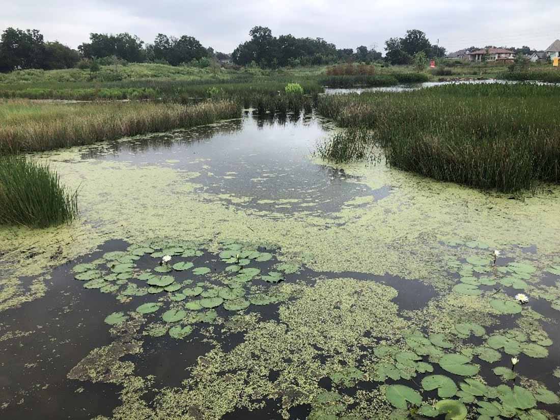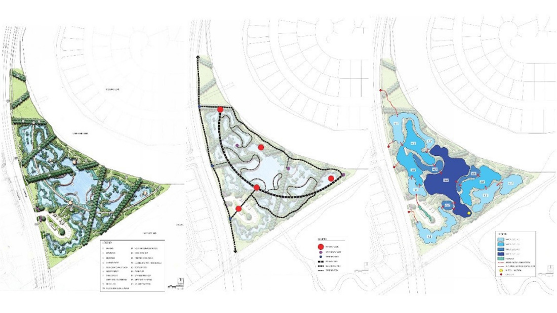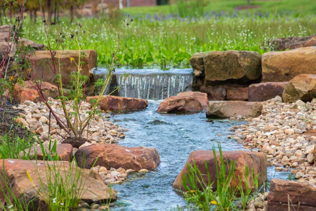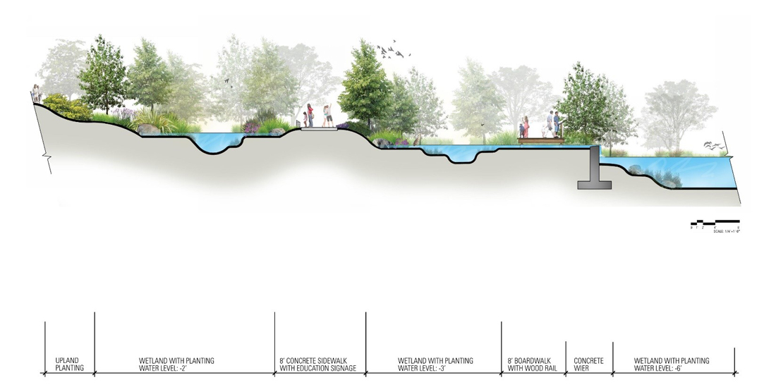 整个9英亩的土地上,基本上有12到18英寸的落差。设计师需要创建收集水的低区域,但是为了使它更具探索性,就像在新环境中磕磕绊绊那样,设计师制造了一系列具有略微不同高度的池塘,这些池塘通过平衡管道进行水文连接。每个池塘比相邻的池塘稍低,最低的池塘位于最高池塘下方约5英尺处。一系列带有补给水的管道——来自服务水处理厂的灰水,确保池塘永不干燥。