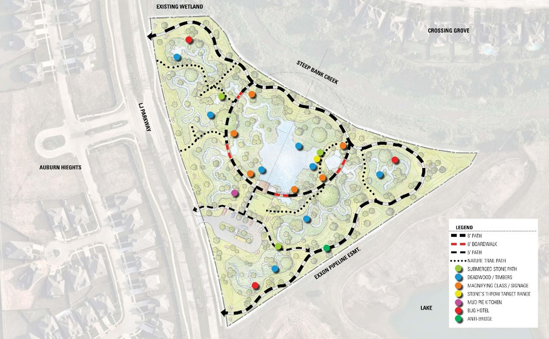 这个社区公园位于Riverstone,这是位于休斯顿市中心西南约25英里处的本德堡县的一个总体规划社区。占地9英亩的公园包括大约4.5英亩的湿地,这些湿地的创建部分是为了满足取代开发失去的湿地的要求,同时也鼓励与附近的自然环境相互作用,为孩子创造记忆并培养对大自然的热爱。