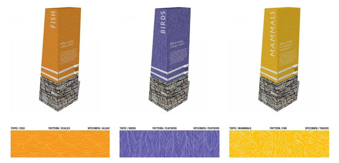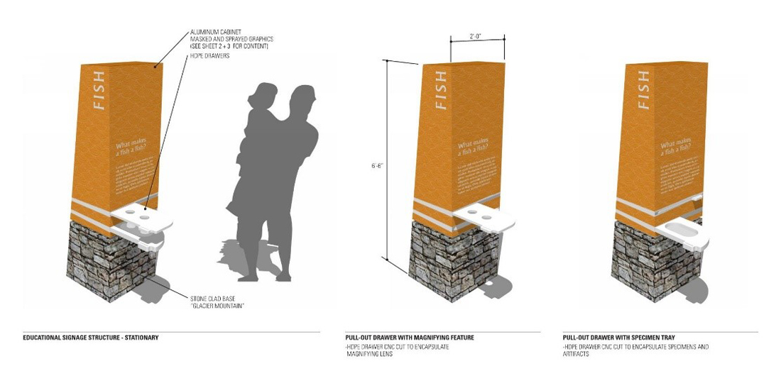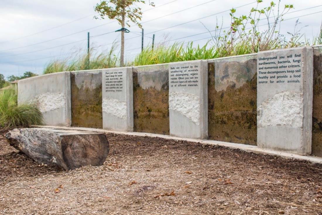 整个公园内都有解释性的标牌,还有许多高大的互动支柱,带有教育文字和拉出式搁板,顶部是一个大型放大镜,可以仔细检查用户发现的任何自然元素。在其他地方,根墙设施展示了各种植物和草的土壤和根系,高大的有机玻璃墙提供了这些地下现象的预览。
