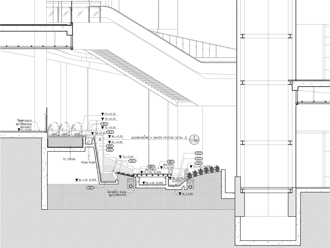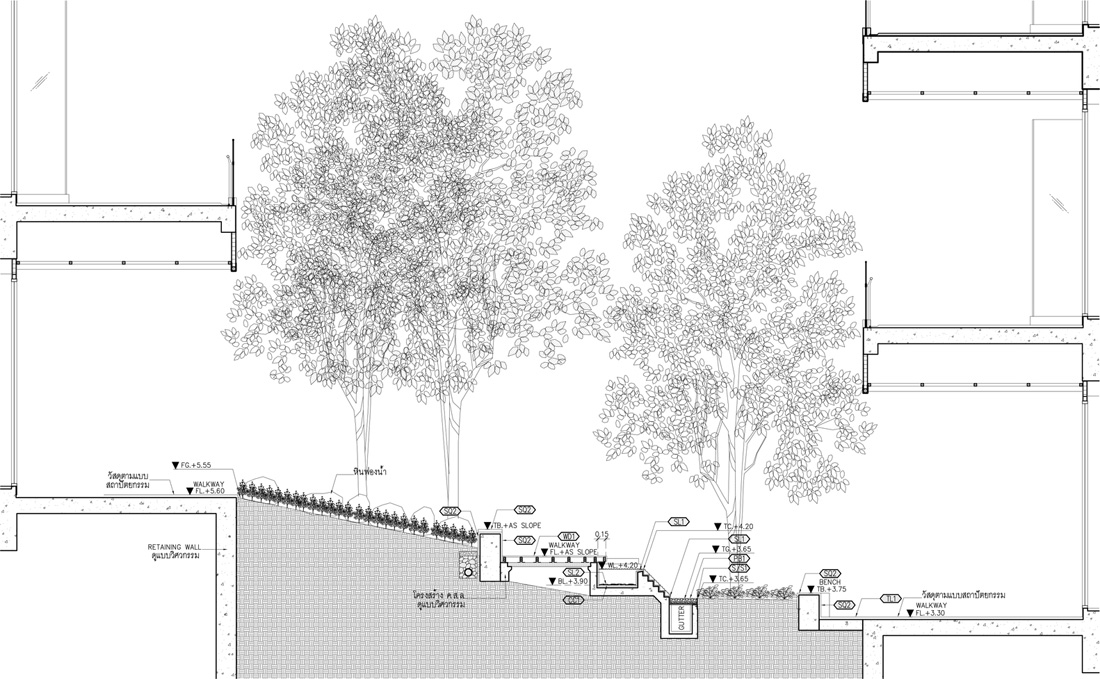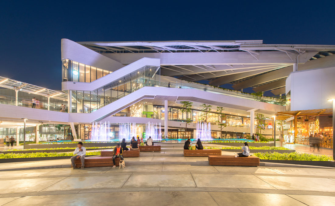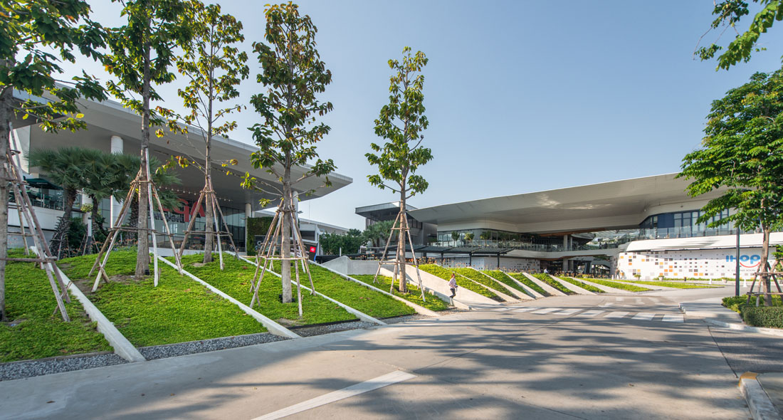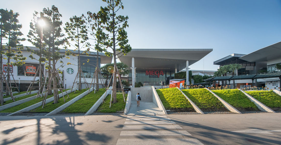 Mega Food Walk是Mega Bangna的一个延伸的半户外扩展区。设计团队在2017年底完成了扩建项目,为庭院、圆形剧场设计景观以及一条木板路,让游客能通过舒适的互动景观功能微气候进入一个充满活力的餐饮商业空间。Mega Food步道内的气候变化由景观设计和创新工程的整合控制的,形成了成功催化活动的水景,大人们可以享受清新森之气息,此外还设置了可供儿童亲近互动的水景。