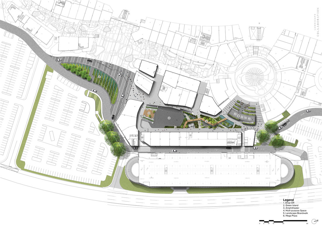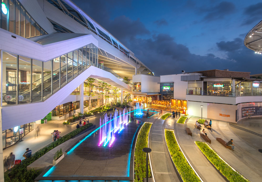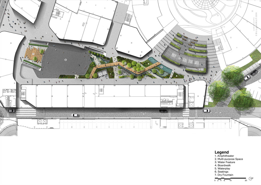 通过不锈钢制成的水杆,可以看到交互式设计的一大亮点。杠杆的把手是专门为用户设计的,可以感受到通过导热管传递的冷水。Mega Food Walk的景观吸引了整个场地的游客,包括在场地延伸的一个终点的舞蹈喷泉广场。扩展区代表了不同学科的结合,创造了一种独特的商业体验,几乎涉及到每个角落和路径。