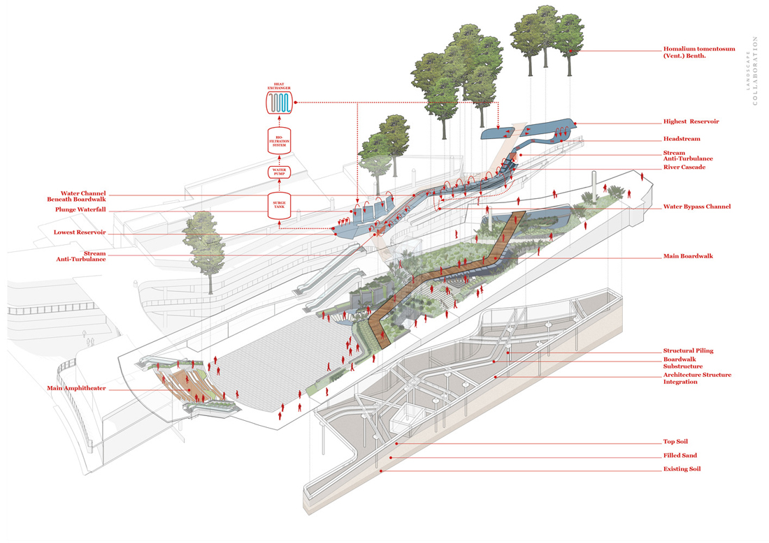 冷水沿着景观的各种特征流动,因为蜿蜒流动,涟漪和瀑布的不断变化的物理形式提供了独特形式的水花和每个弯曲处的蒸发冷却效果。此外,隐藏式喷射风扇营造出轻盈的气流,从水面的表面散发出凉爽的水分。因此,气候被调节到理想的人类舒适区域,同时还为植物生长提供了额外的水分。