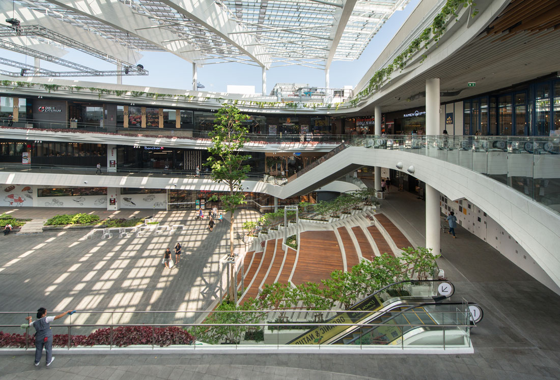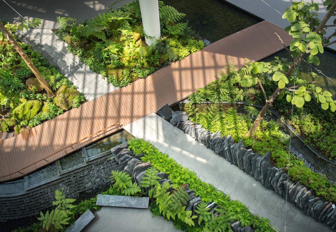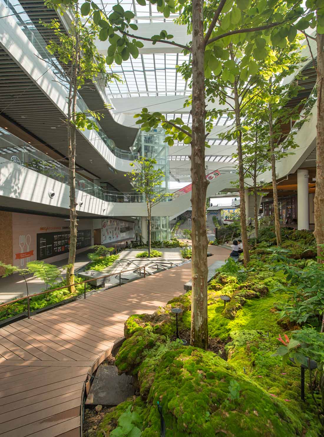 集成的冷却系统通过将湿度和温度控制在理想的温度,为景观增长提供了额外的空间优势。设计的“森林”主要组成植物是亚热带、热带气候的植物,包括精细纹理的蕨类植物和苔藓,营造出独特的商业景观,将周围的餐厅与自然绿色融为一体。基于商场要求,设计师创造了一种体验位于不同层面的景观和商店的新方式:场地凹陷的下层为各种活动创造一个下沉的广场空间。