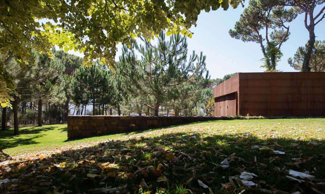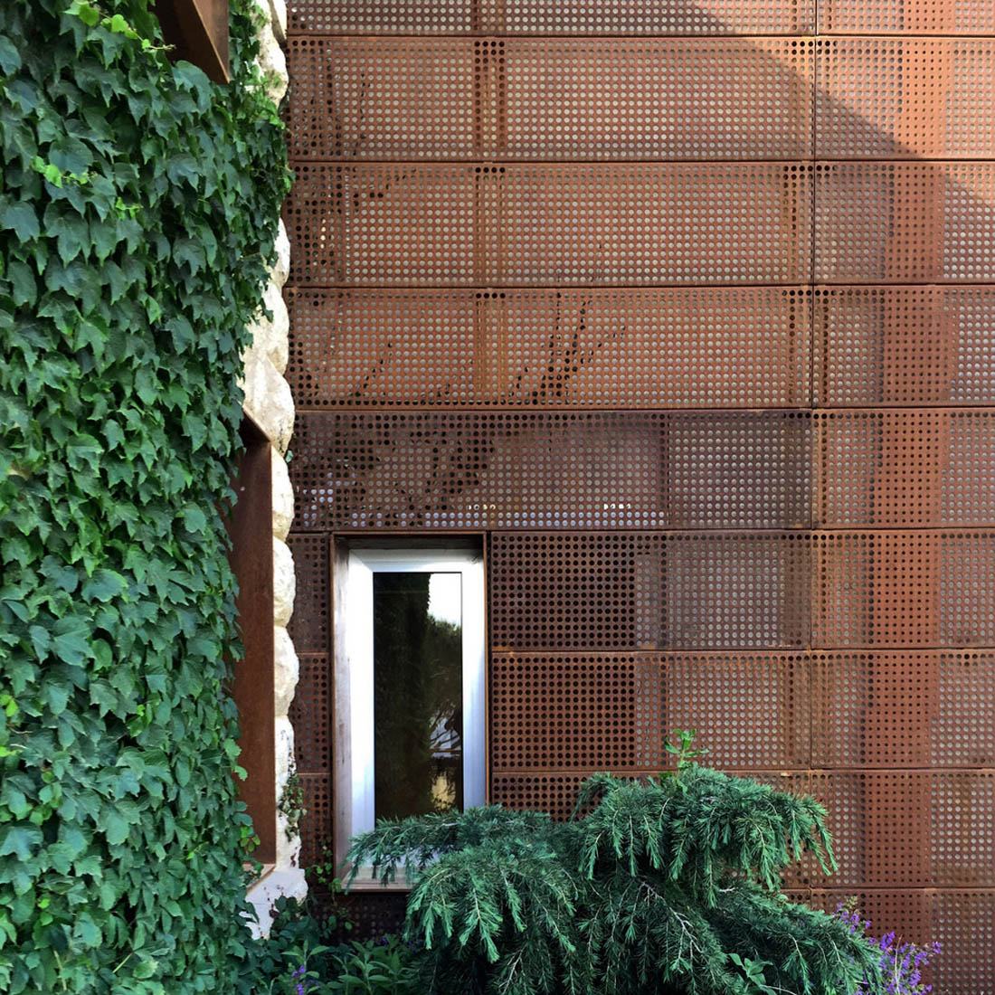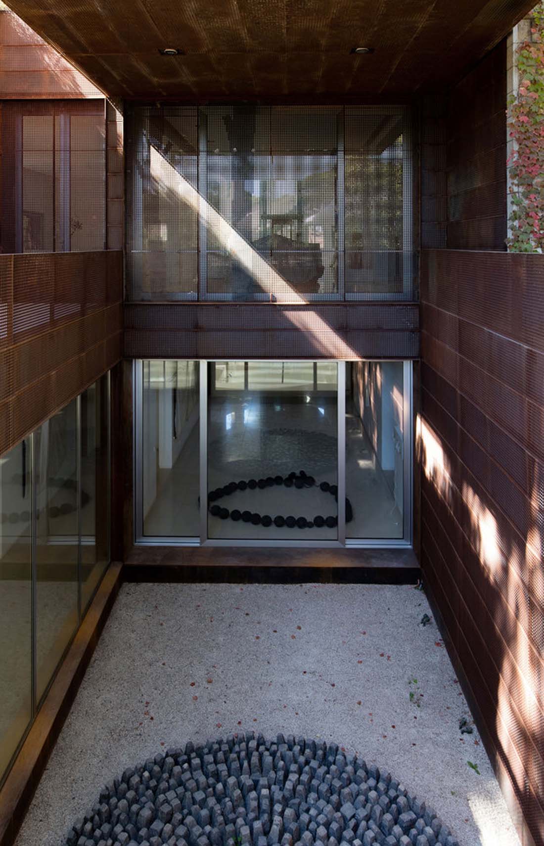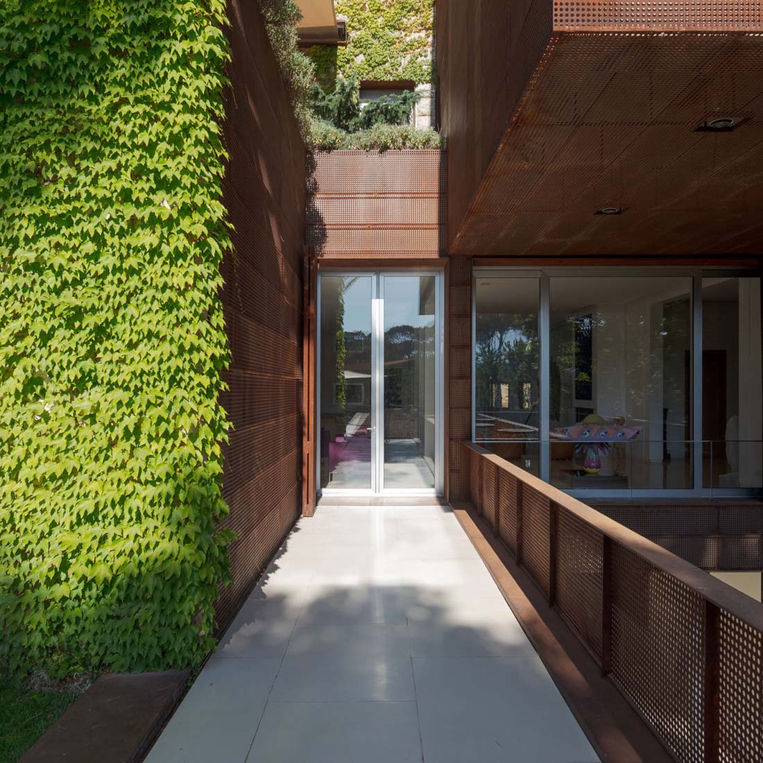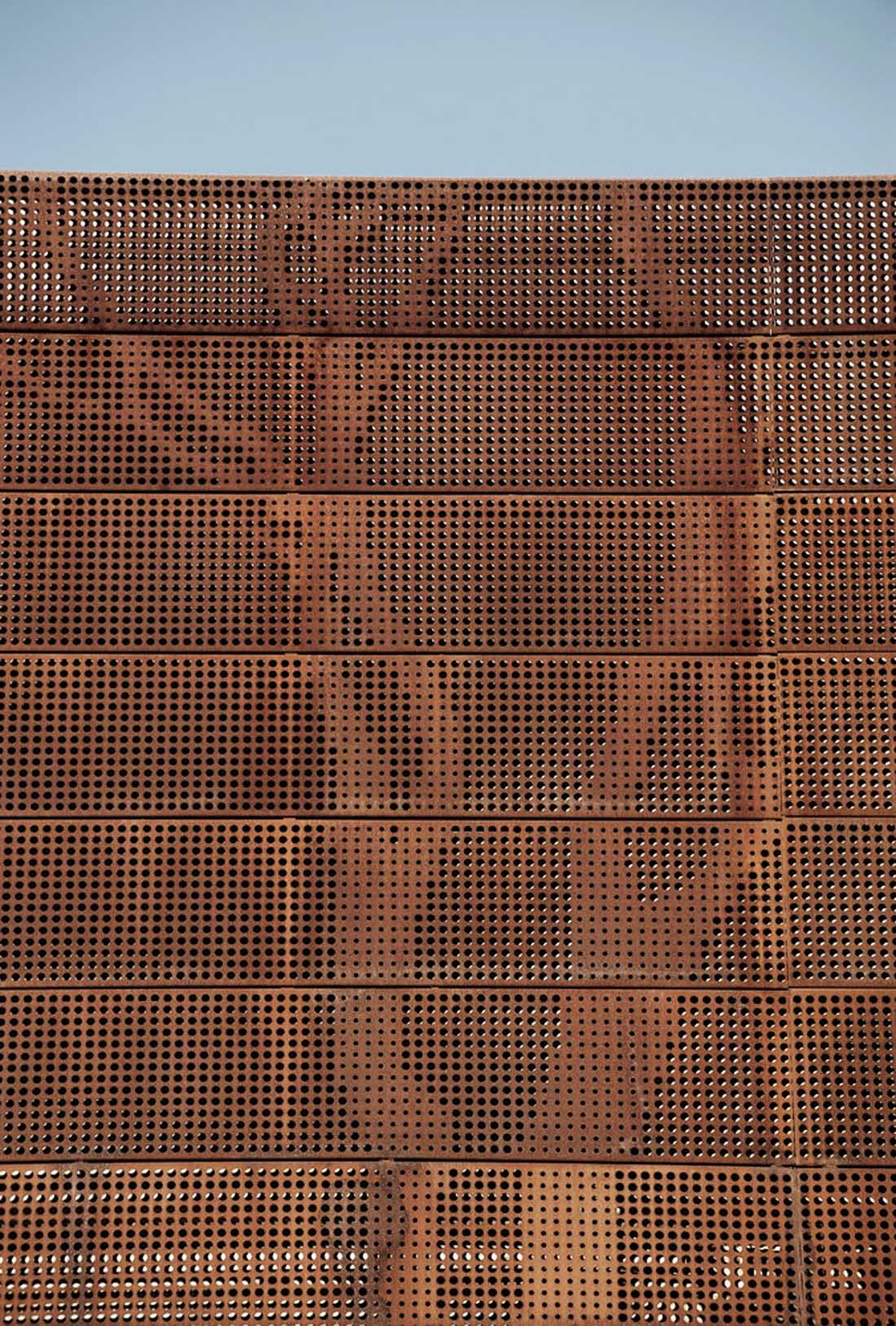在护栏上方和房子的东南端可以看到它们美观的轮廓,他们在一个低矮的35米高的钢筋混凝土和长方形玻璃屋顶上种植了一个突出的屋顶。钢的皮肤随着时间的推移而变色,并被小小的圆点刺穿的树木的图案。