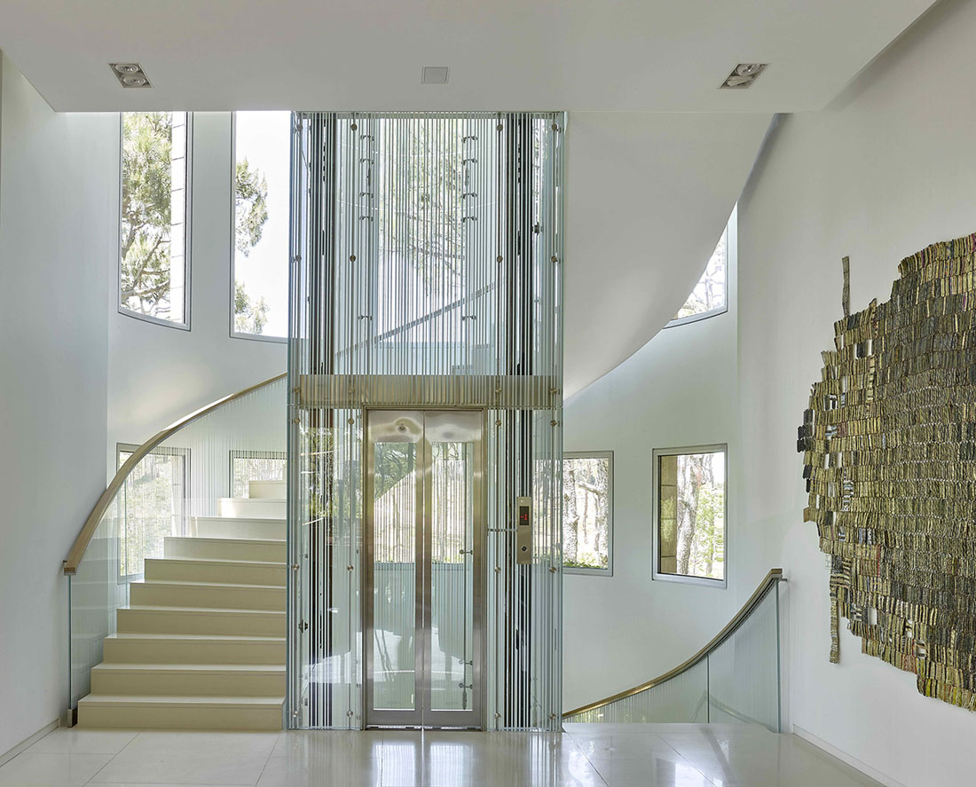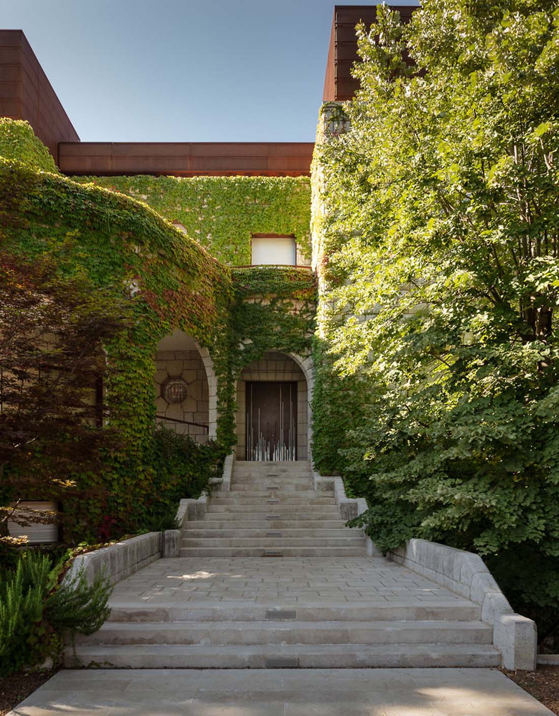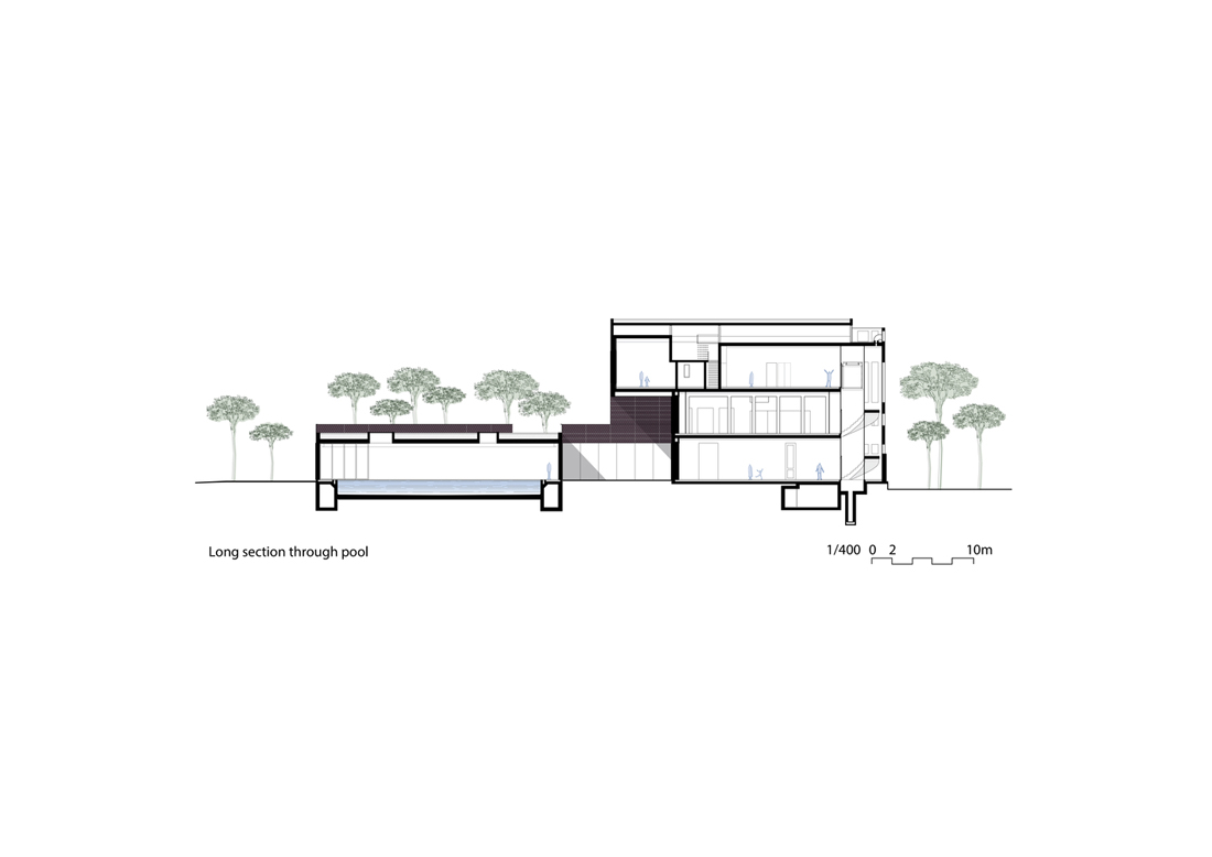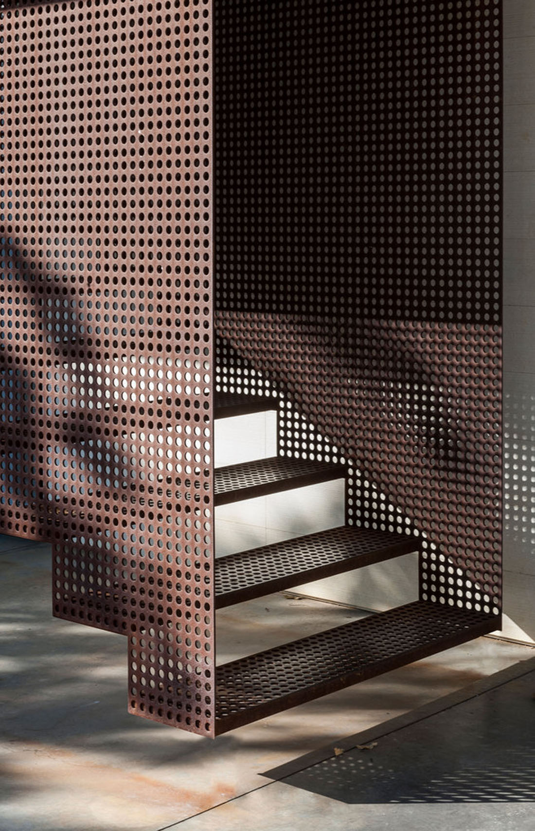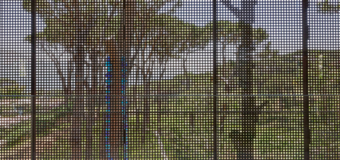 在护栏上方和房子的东南端可以看到它们美观的轮廓,他们在一个低矮的35米高的钢筋混凝土和长方形玻璃屋顶上种植了一个突出的屋顶。钢的皮肤随着时间的推移而变色,并被小小的圆点刺穿的树木的图案。