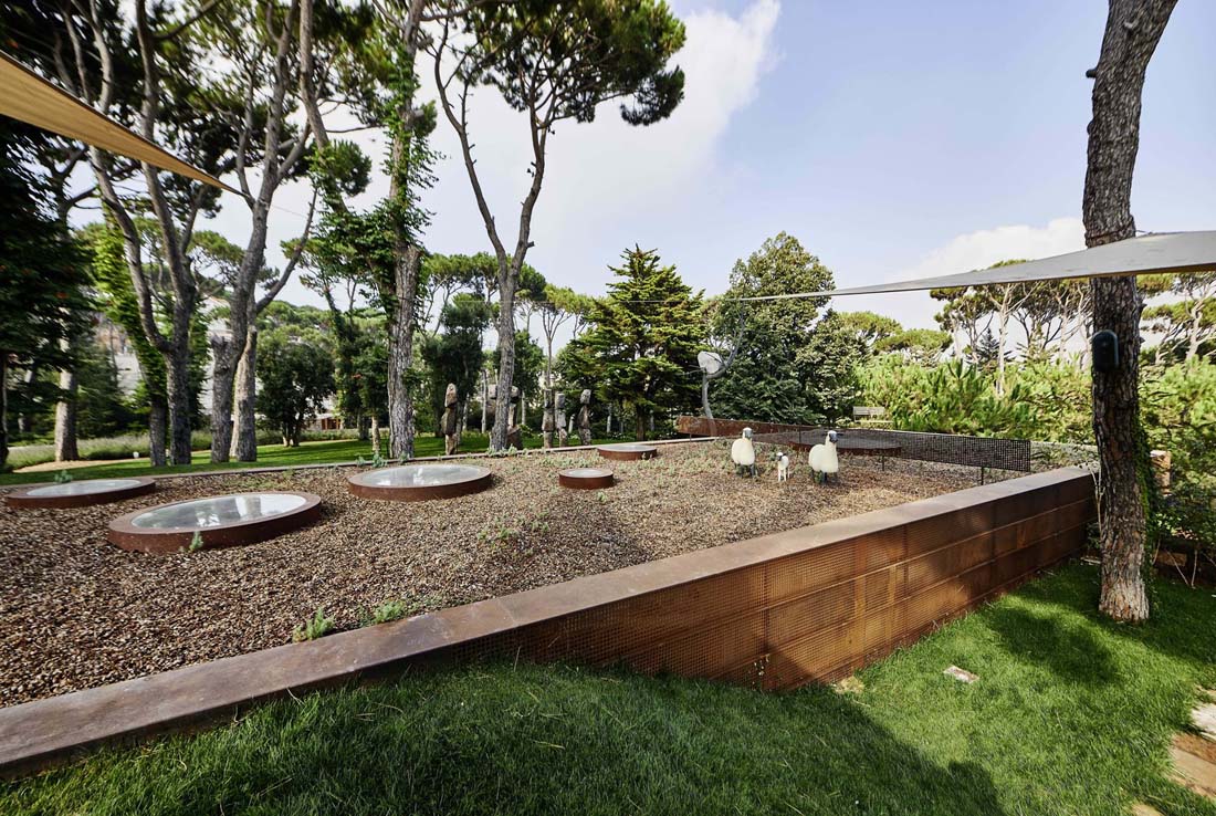 爬上的植物和葡萄藤在废墟中殖民,掩盖了过去,清理了它历史悠久的房子。花园种植了超过1000棵松树:伞松,橡树,软木树,黎巴嫩雪松和其他原生树木装饰了景观,其中还包括一个玫瑰园。