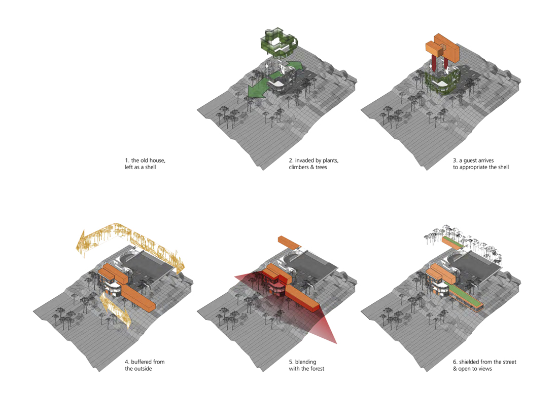 这一切都始于决定如何进行改造:是否与剩下的东西一起共存,因为尽管有痛苦的历史,所有者希望保留与祖父家的一些联系;或者说从头开始擦除连接和不幸的历史。最后,决定采取两种方式。被烧毁的废墟,被加固并重新用作一个历史性的外壳,可以插入一个全新的家庭,是对寄居蟹的一种模仿建筑。