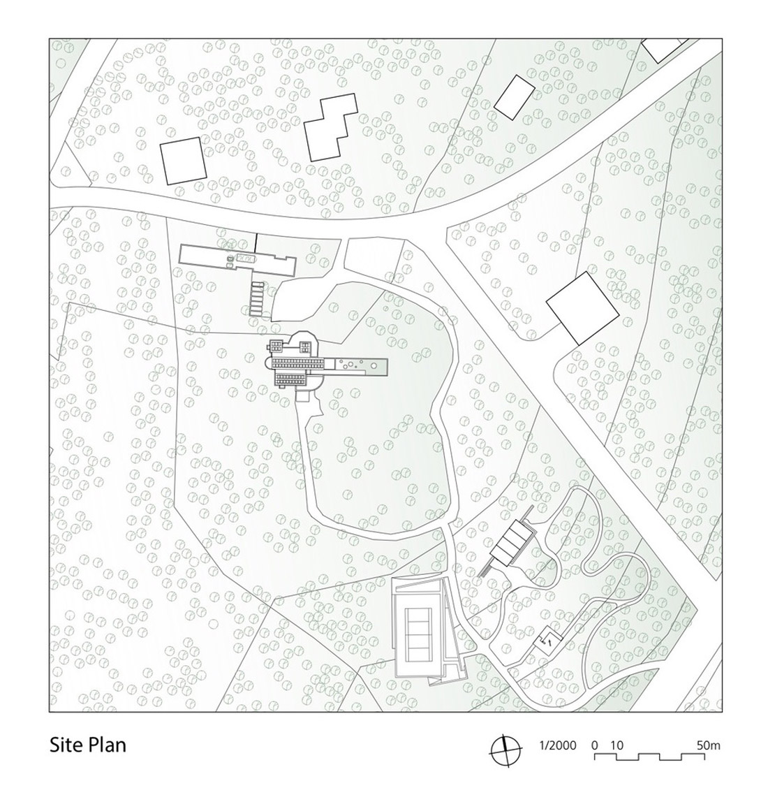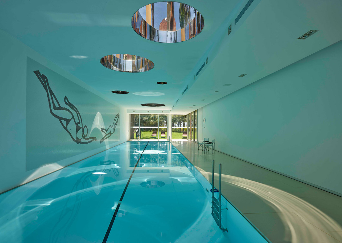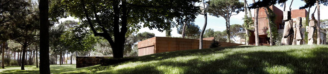 该体积部分沉入地下,设有游泳池和艺术画廊。它穿过一片重新种植的松树林,插在倾斜的地面上,朝向远处的雪山。