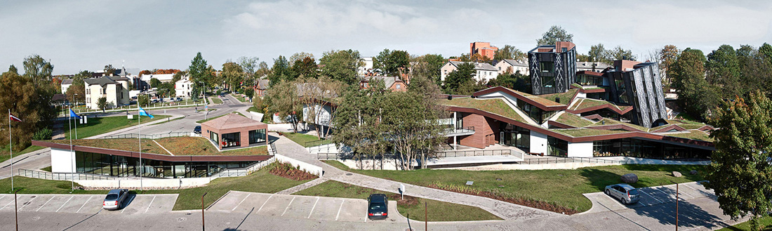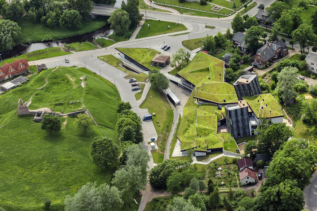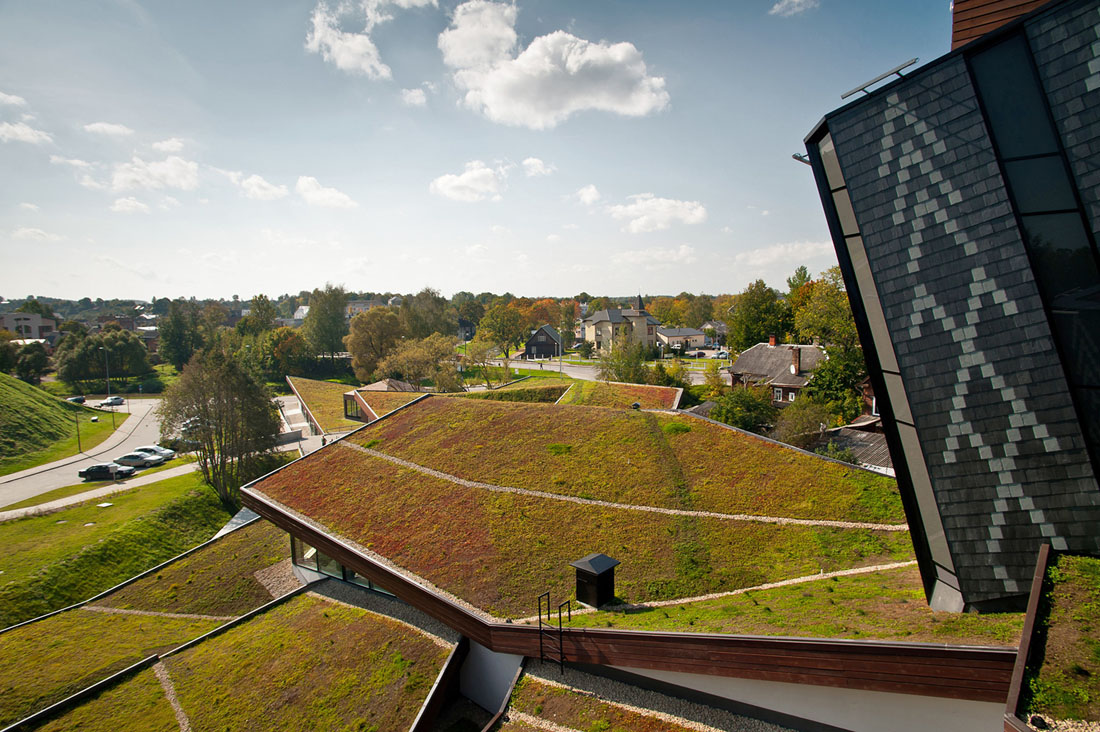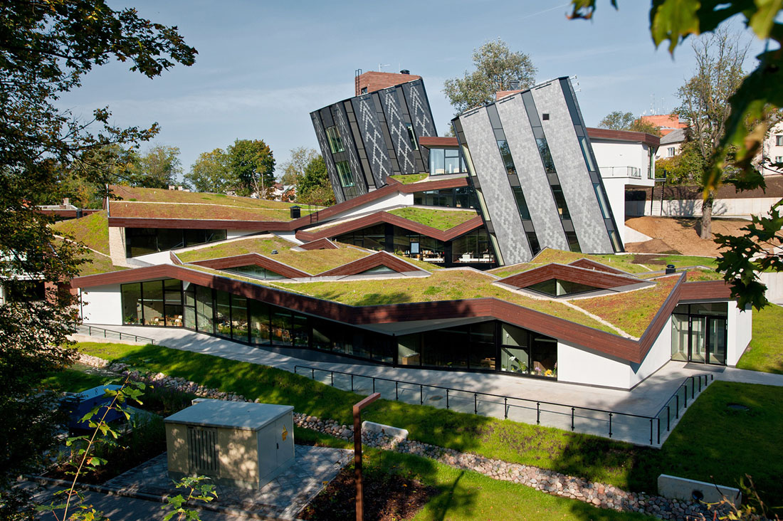 卡在绿色建筑中的“铅笔”是现有苏维埃时期建筑的前身。建筑深入地下,五个立面,几何三角形的绿色屋顶,成为结构的主要特征。