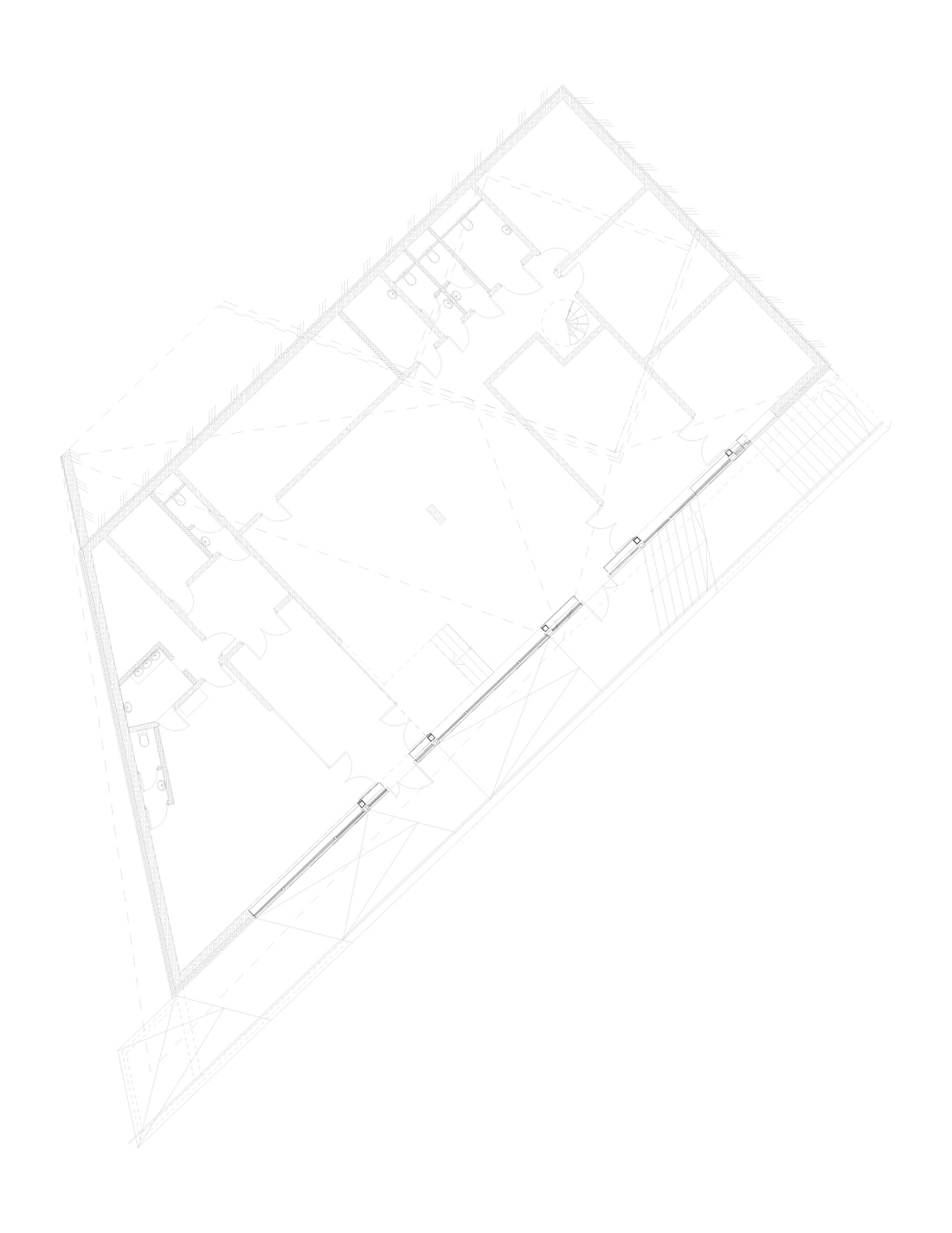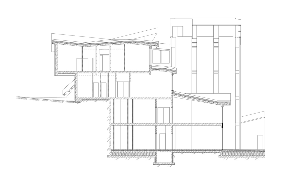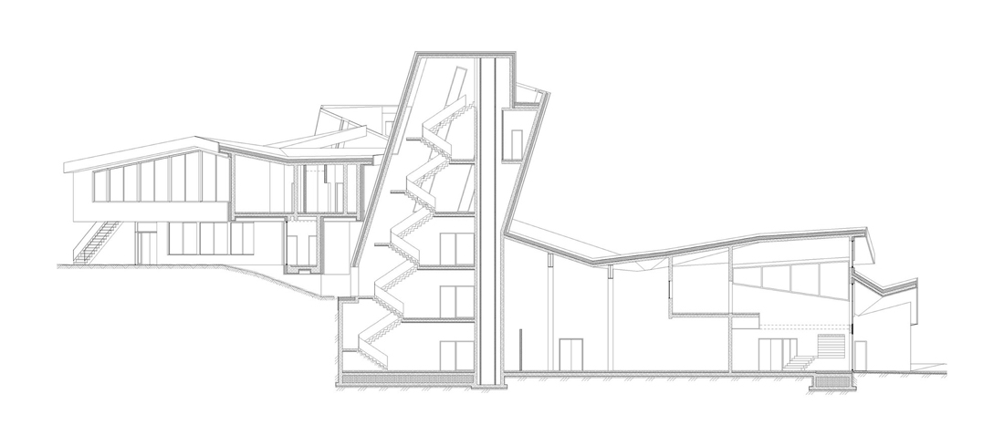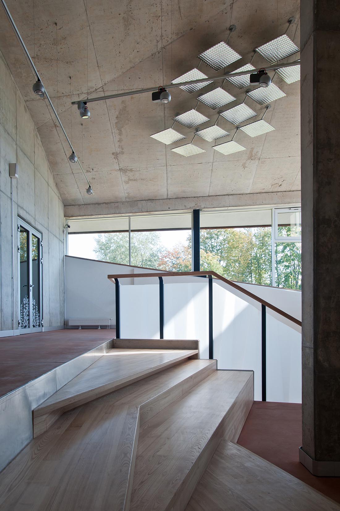 该建筑是一个外露的整体混凝土结构,外墙涂有灰泥。尽管如此,大多数房间都是矩形的:暴露的混凝土和可变窗户几何形状的戏剧性天花板创造了惊人的多样性和独特的空间。