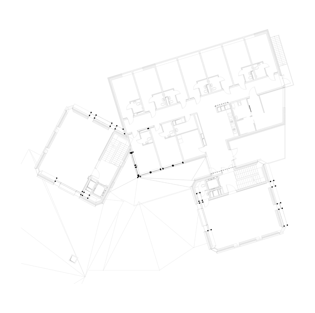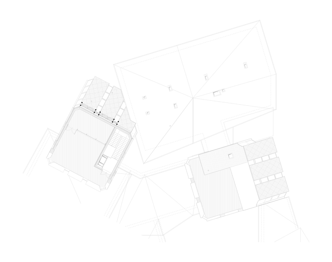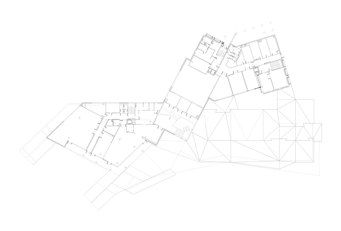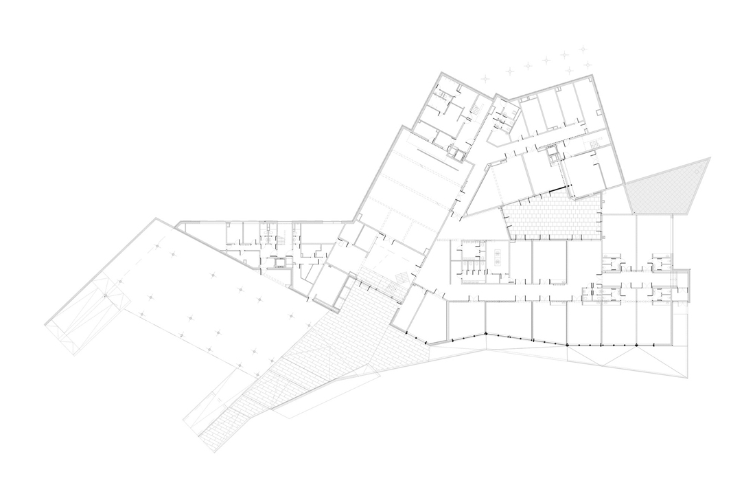 屋顶的形状不仅为孩子们创造了安全感和保护感,而且通过各种开口进入所有房间,大厅和走廊,可以提供充足而多样的自然光流,从外面看,它在黑暗中神秘地闪耀着。底楼设有温馨的内部庭院,为客人提供远离地面的活动室。建筑物周围的混凝土和绿色表面的景观延续了与屋顶相同的几何原理,在每个细节中都具有令人惊讶的雕塑感和艺术感。