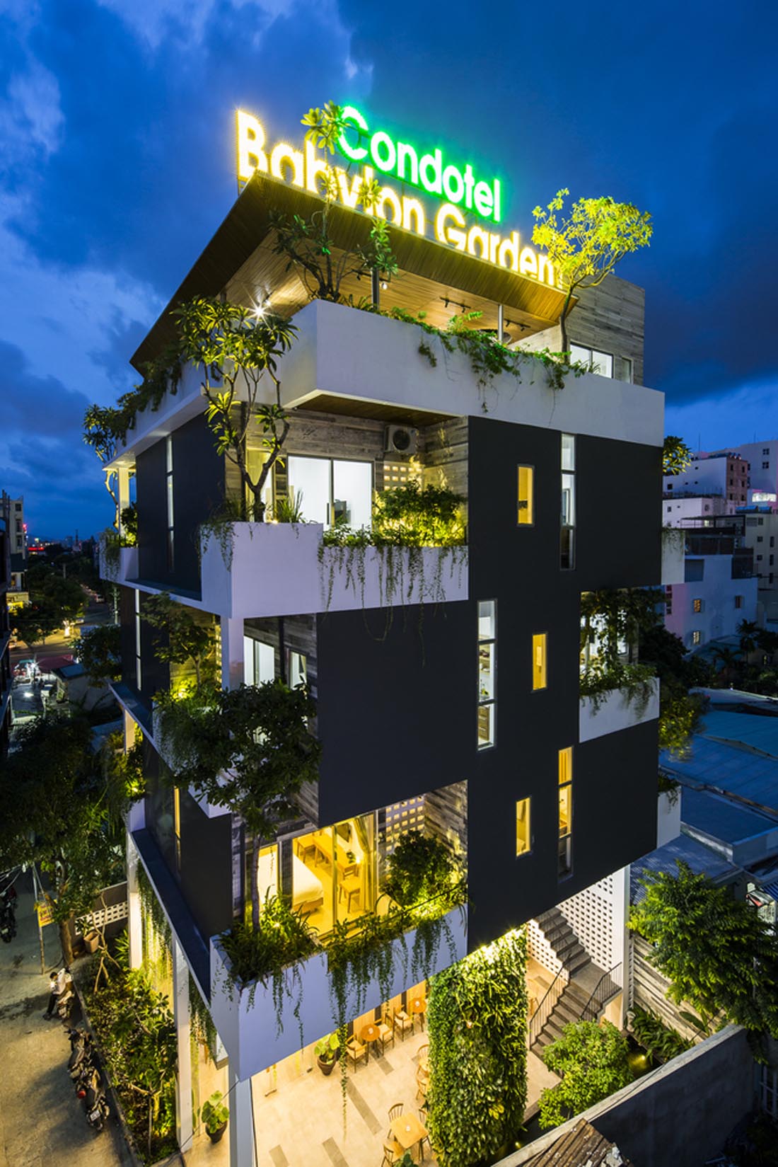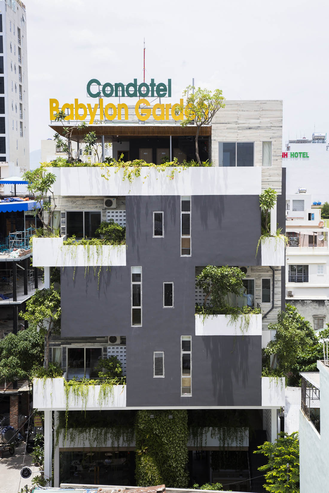 巴比伦花园位于岘港最受欢迎的海滩附近拥挤的海滨酒店区。由于其现代化的绿色外观作为空中花园,与附近的大都是平凡的建筑形成鲜明的对比。它提供宁静的自然体验,远离喧嚣。设计师的设计挑战是建造一些特别的,接近自然的但不受高度限制的可见和美丽的东西。