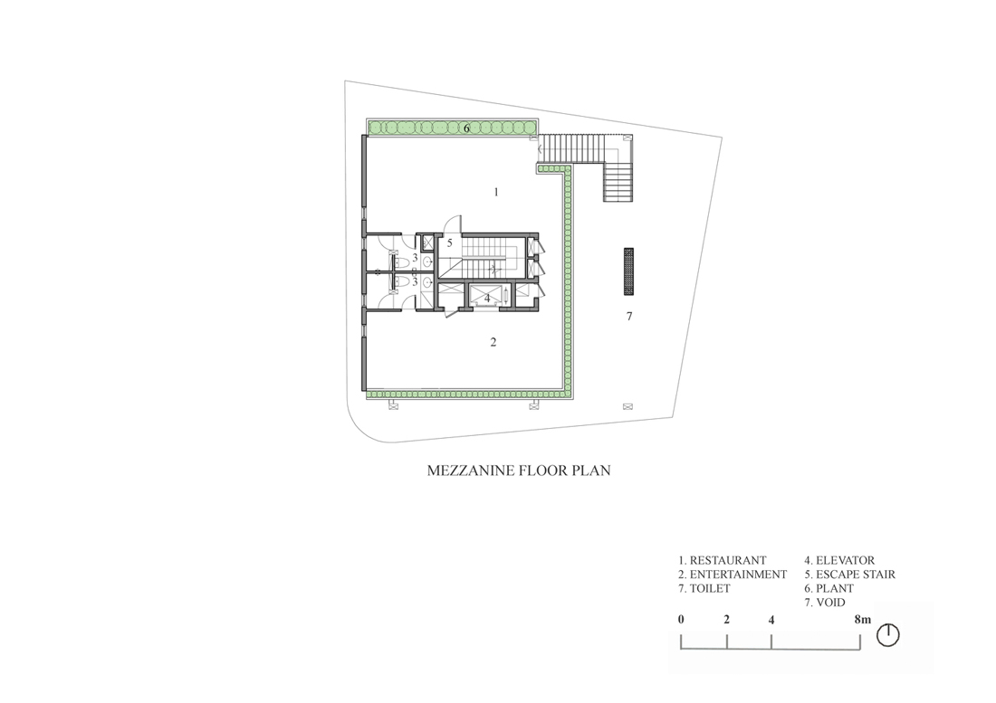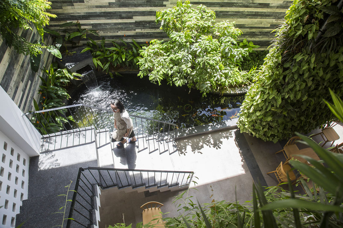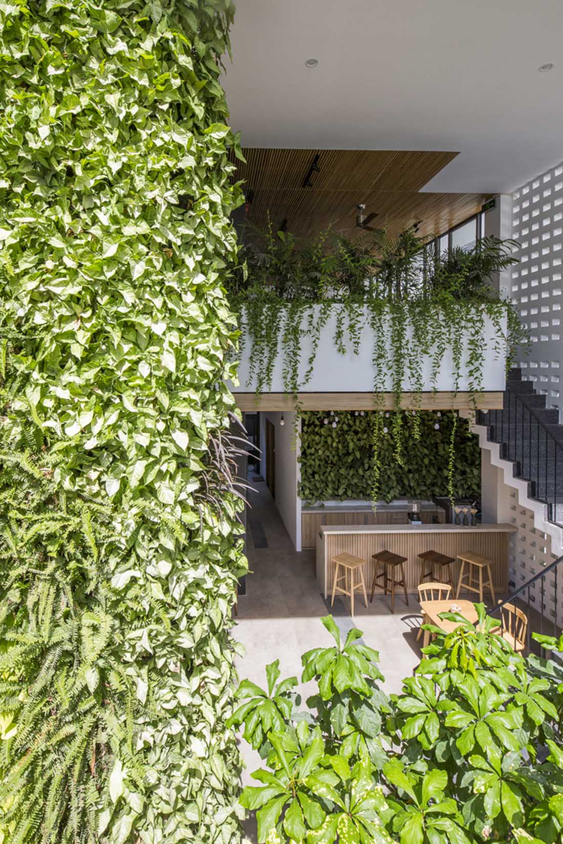 一楼和夹层楼的二楼餐厅种植悬挂到地板植物。这种专门的垂直种植植物用于悬空平台会营造美丽的效果。前方区域狭窄,但内部的景观和感觉通过垂直种植,锦鲤湖、非常高的天花板、后墙的自然通风都得到了扩展,我们在无意识地感受到了大自然。