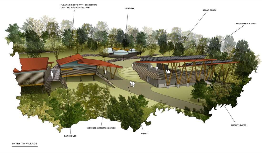 项目大楼和浴室位于树木繁茂的山坡上的现有草地上。露天项目建筑将被挖到一个小山上,后面是一个土堤,露营者要观星的时候还可以进入建筑的上层。该项目大楼将为剧院和音乐表演提供空间。浴室是每日洗浴场所,也是露营者收集和讨论当天活动的场所,由遮蔽的屋顶和深悬的木质屏风墙构成,可提供景观和充足的空气流通。