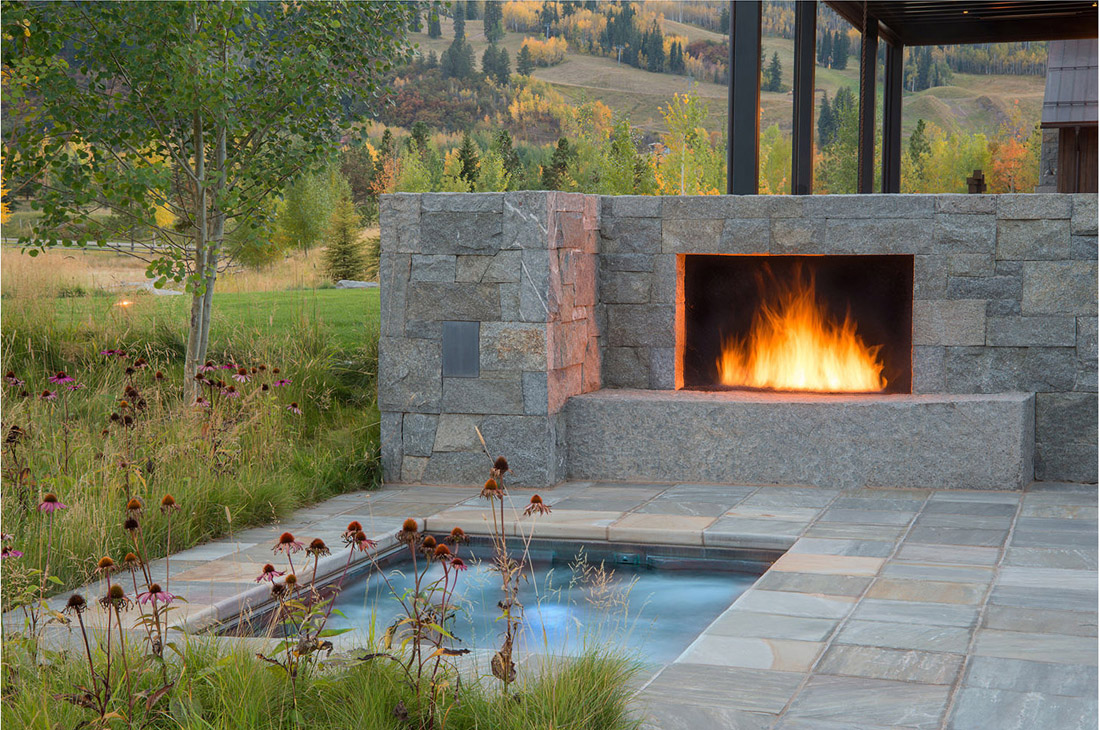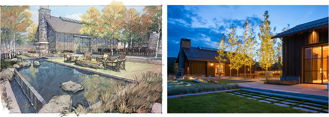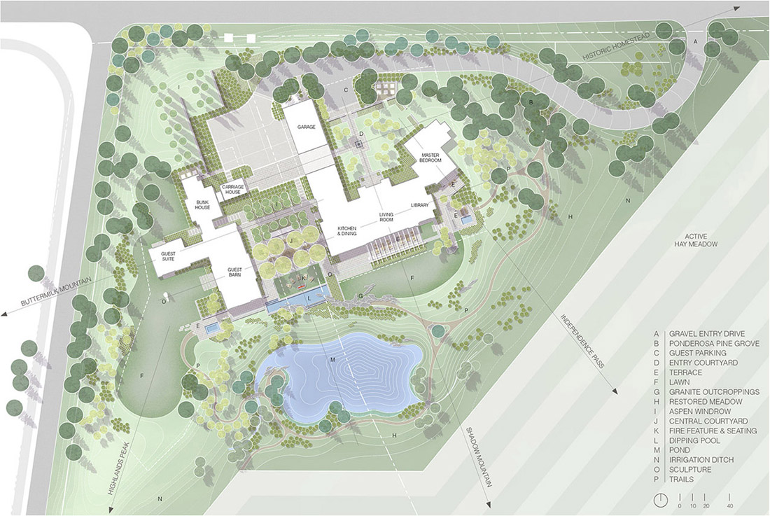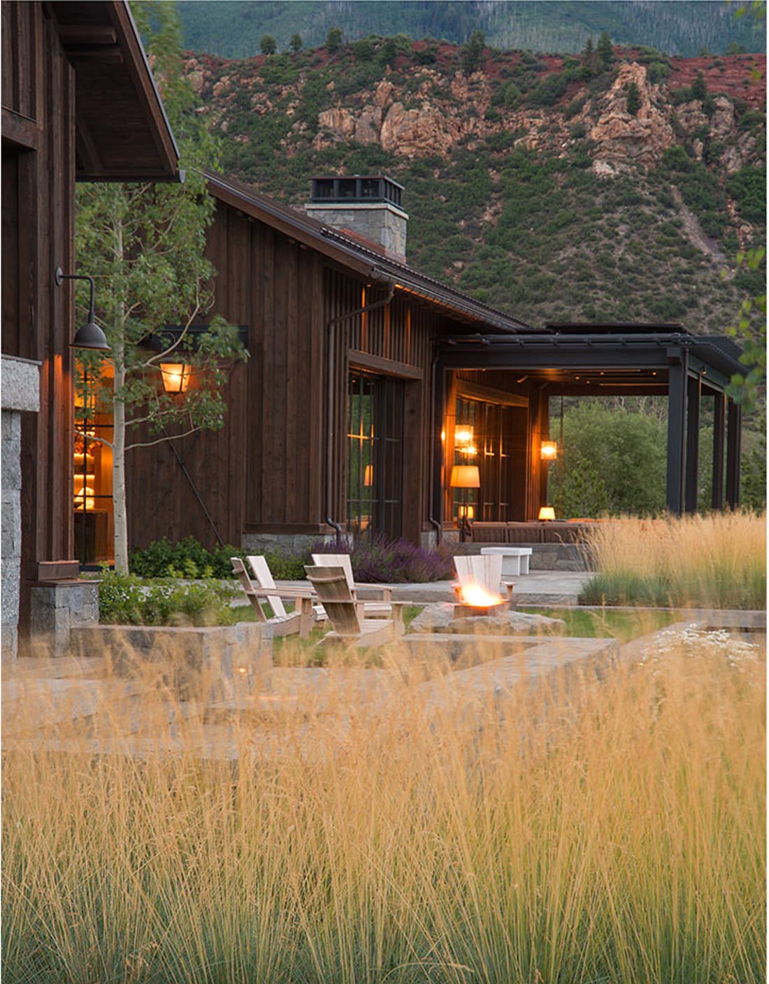 而在这个设计中,景观和建筑无缝衔接,模糊了室内外空间的界限并形成一个富有凝聚力的空间。身处于海拔7,800英尺之上的建筑眺望着东、南、西侧广阔的农田、裸露的小土丘、春季浅滩与远处13000英尺高的延绵山峰。而无论是高原上炙热的阳光、盛行风向、温度变化还是冬季的大雪都对室外生活方式、植被种类的选择以及景观元素的尺度有着决定性的影响。