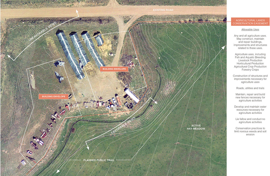 垃圾碎屑,贫瘠土壤和周围的建筑废料层层堆积成一个12英尺高的“丘陵”,严重破坏了场地的生态系统和视觉品质。而随着用地性质从牧场到居住的转变,垃圾填放区被彻底覆盖,陡峭坡地之上的空间被划分为两个相邻的建筑围护结构。