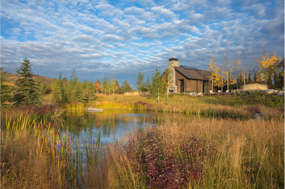 位于草甸与中央庭院间,占地7200平方英尺的池塘进一步加强了场地与水密不可分的关系。池塘边植被繁茂的水岸栖息地吸引了众多候鸟与野生动物在此繁衍生息,同时也储存着场地所需75%的灌溉水源。挖掘池塘所清出的土方被用于重塑地形,缓和坡度。景观设计师巧妙地利用了起伏的地形,让无边浅水池与下方的池塘从视觉上连为了一体。