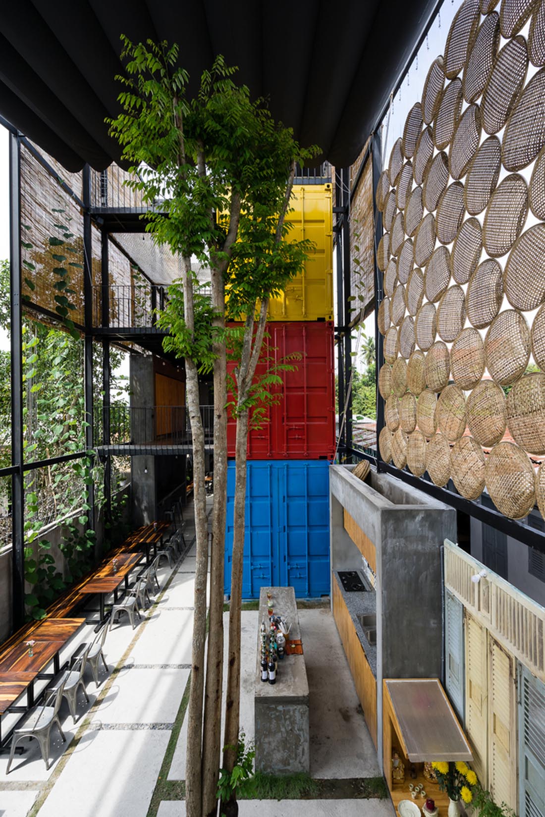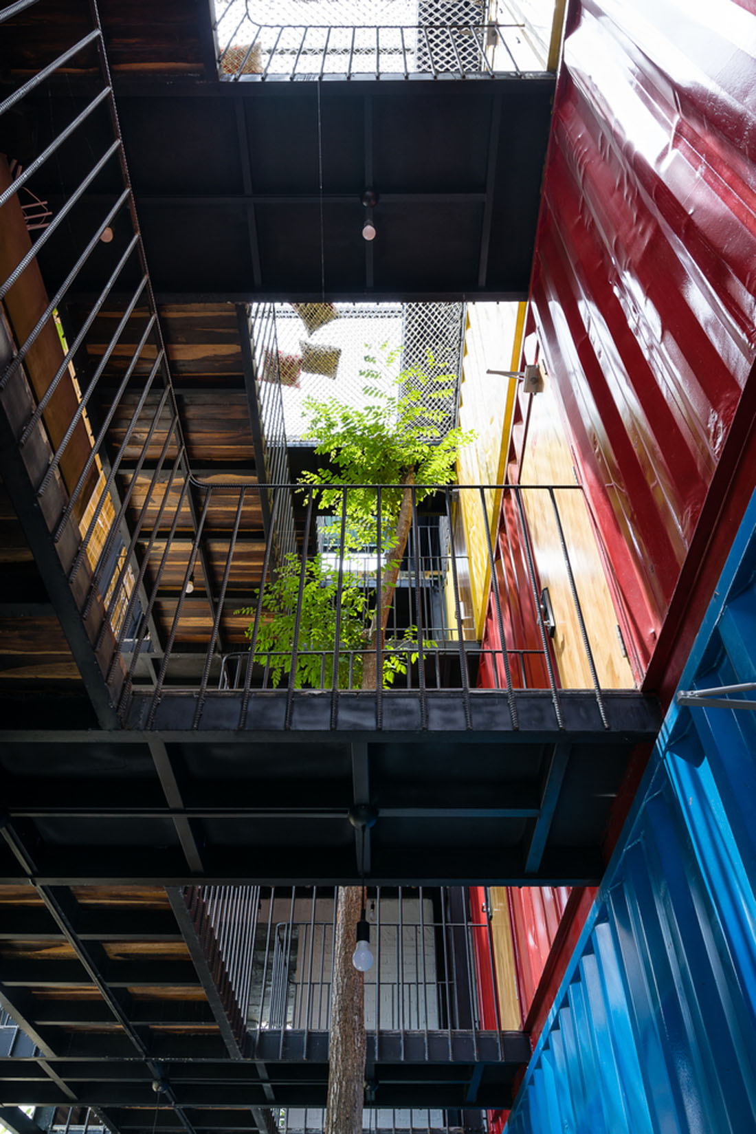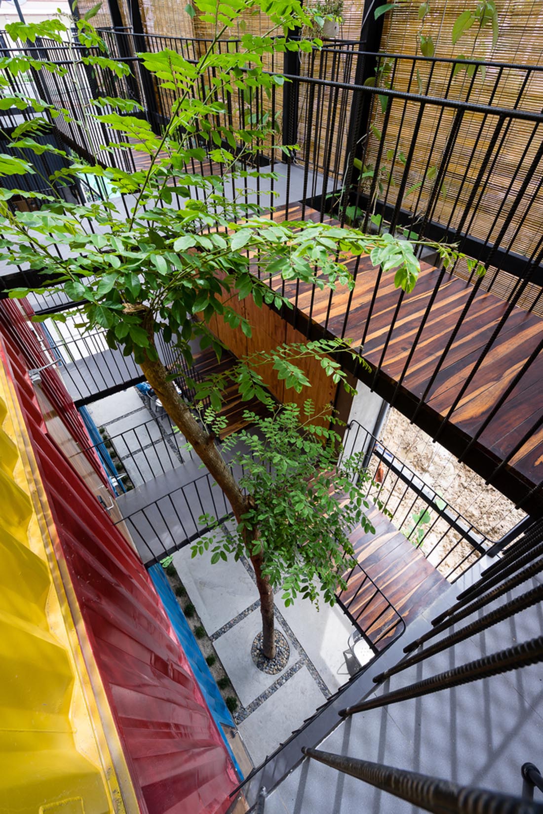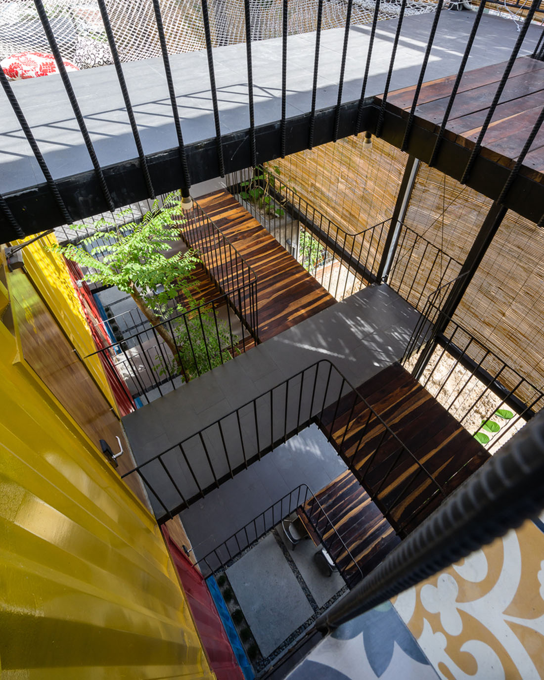 通过使用老旧的集装箱,钢架和绿树,凉棚,Ccasa青旅带来了强烈的工业感,但又不失自然的感觉。此外,还巧妙地使用了水泥砖,旧木窗,扁平风筐,粗制水泥巧妙的吸引了注意力,并唤起一些越南老建筑影像。青旅周围的绿色凉亭不仅使它看起来更绿色,而且还起到第二层皮肤的作用,以防止阳光直射和冷却室内空气。