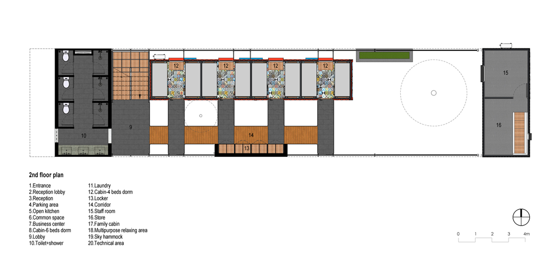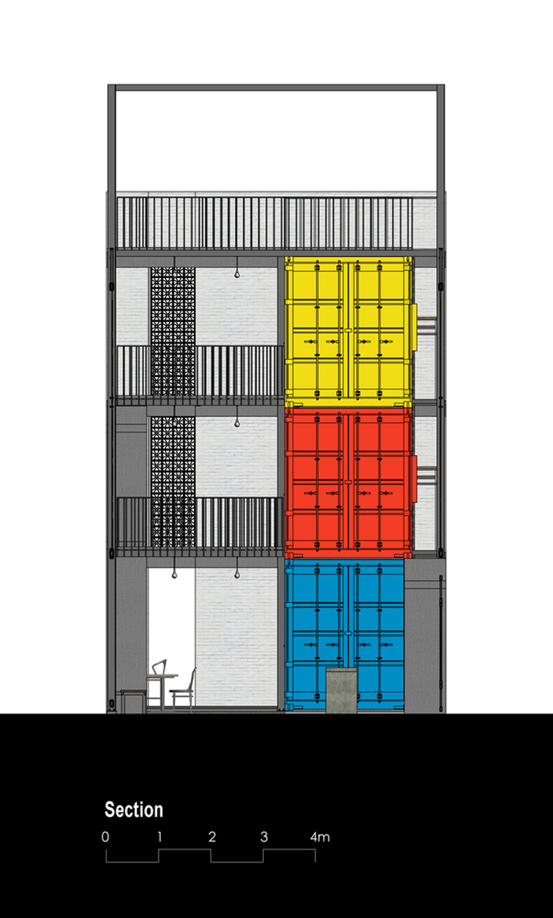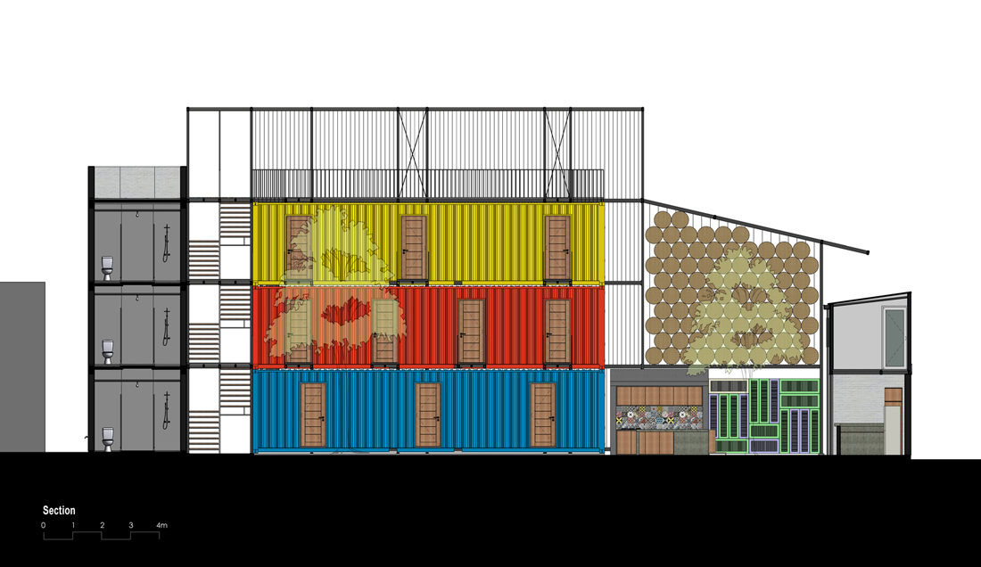 宿舍由三个功能块组成:服务区,睡眠区和洗涤区。其中,服务区由钢框架和黑色金属板材制成;睡眠区设置在三个旧的集装箱中,分别涂上三种颜色,象征着三种类型的卧室;洗涤块以白色漆、砖砌、混凝土构成。这三个街区通过公共空间相连接,共享空间以及最大限度地向自然开放,这是使项目变得柔和和谐的主要特征。