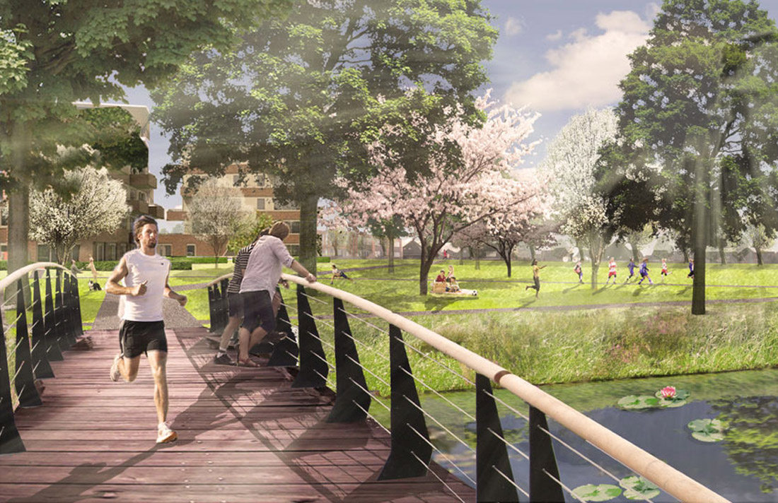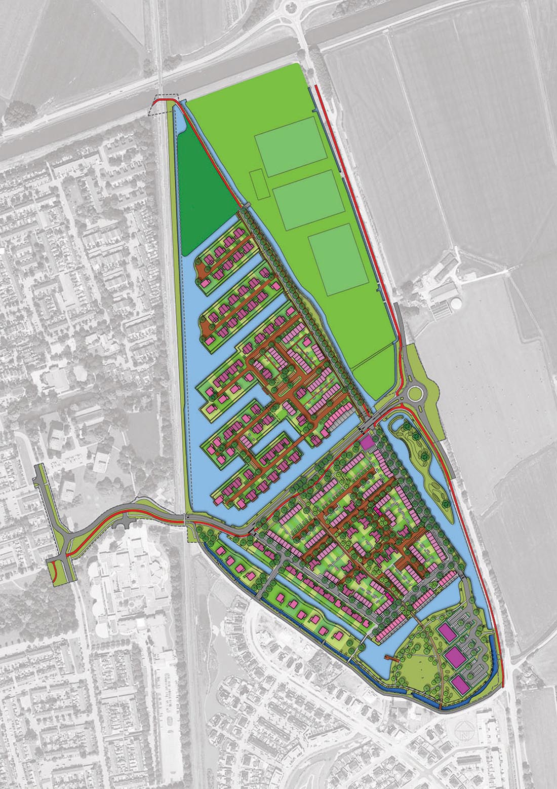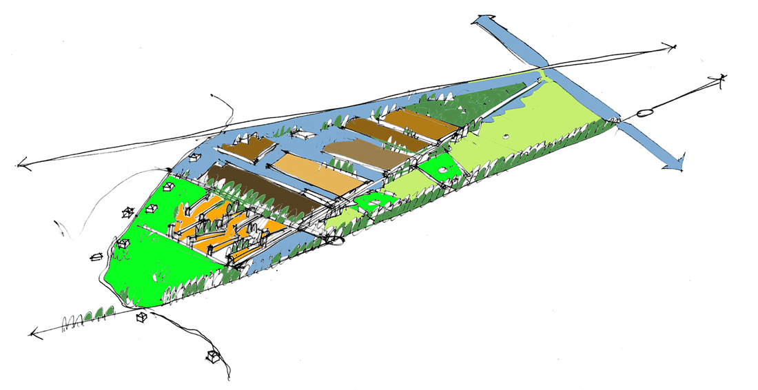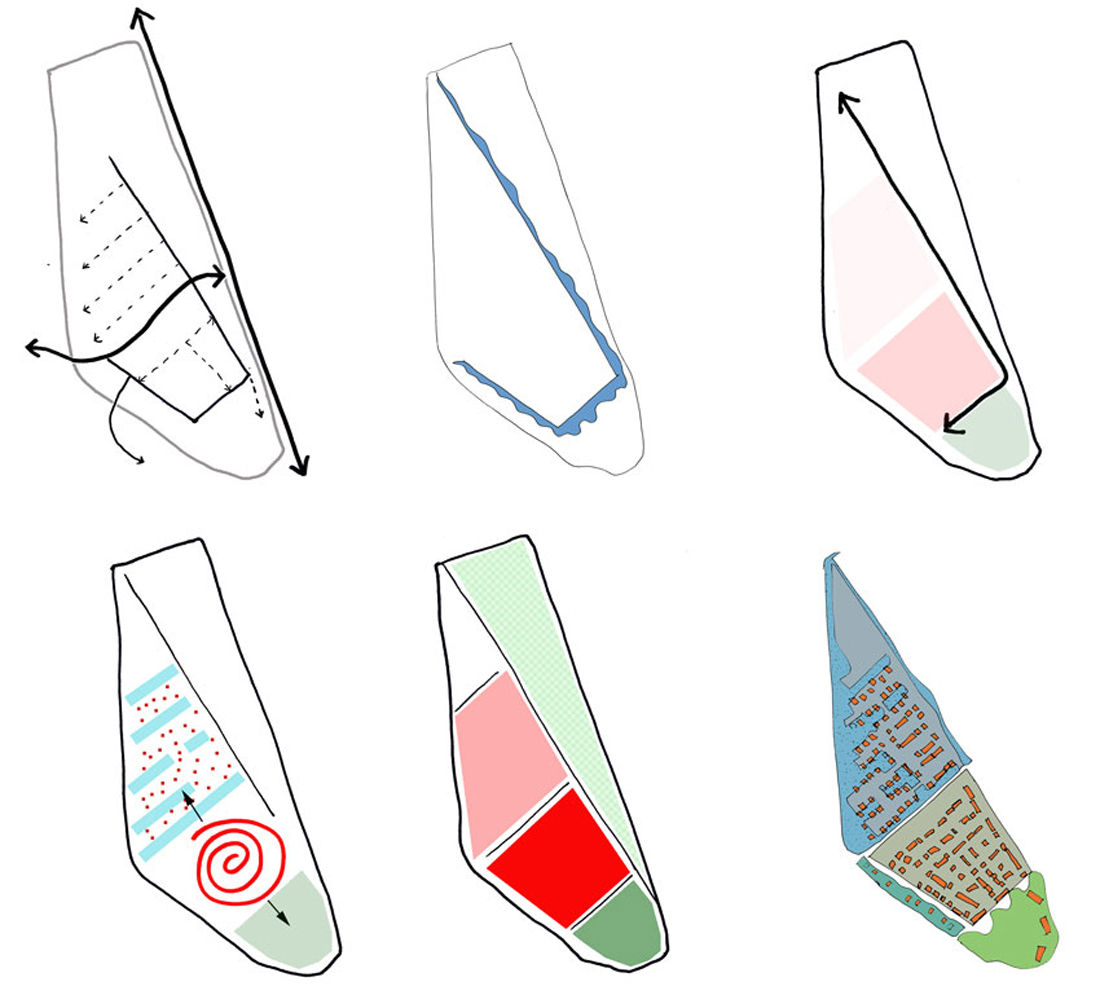 小镇规划的灵感来自于基地内已有的一条小溪。这条小溪是城市开发区的界限,并将这一片区划分成不同的街区。