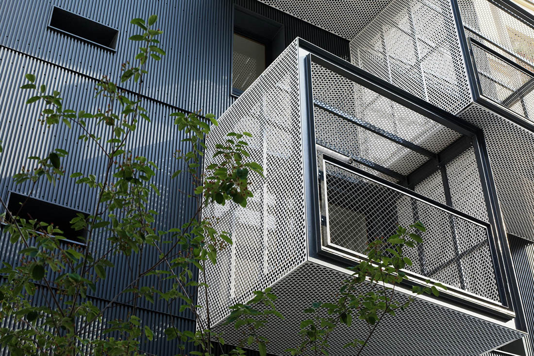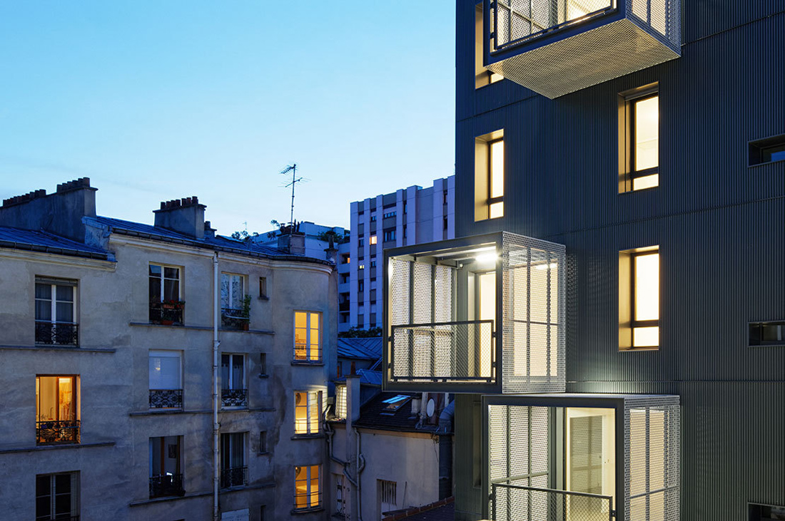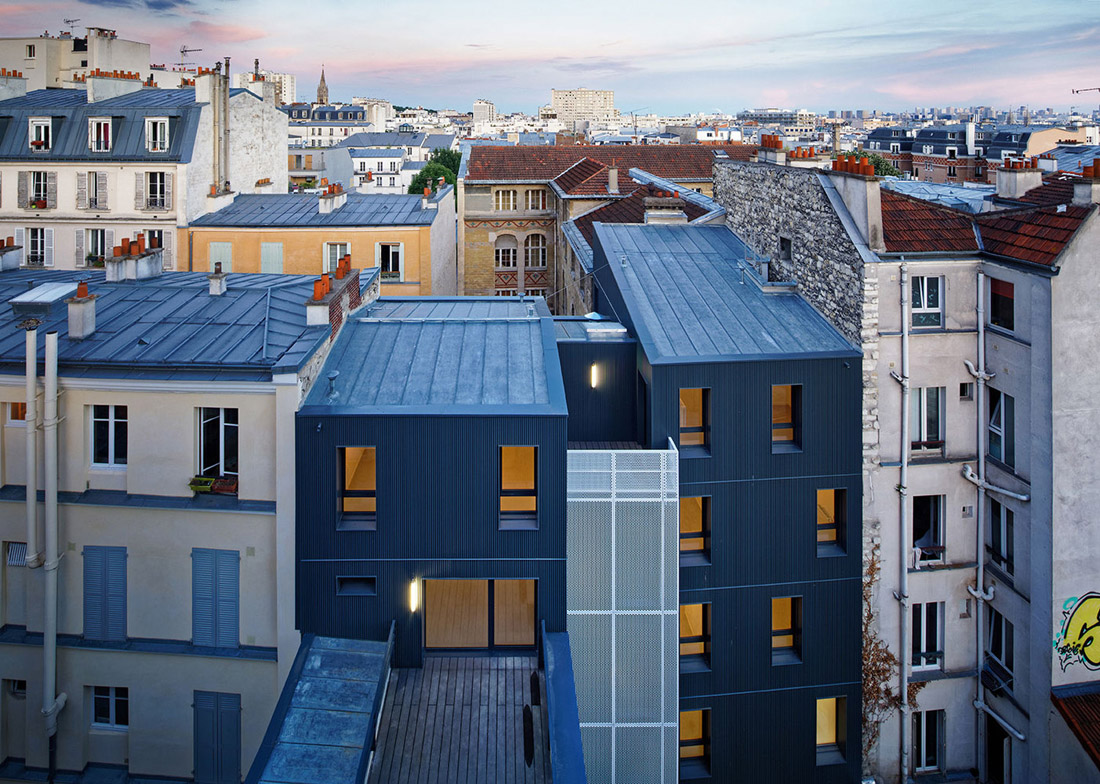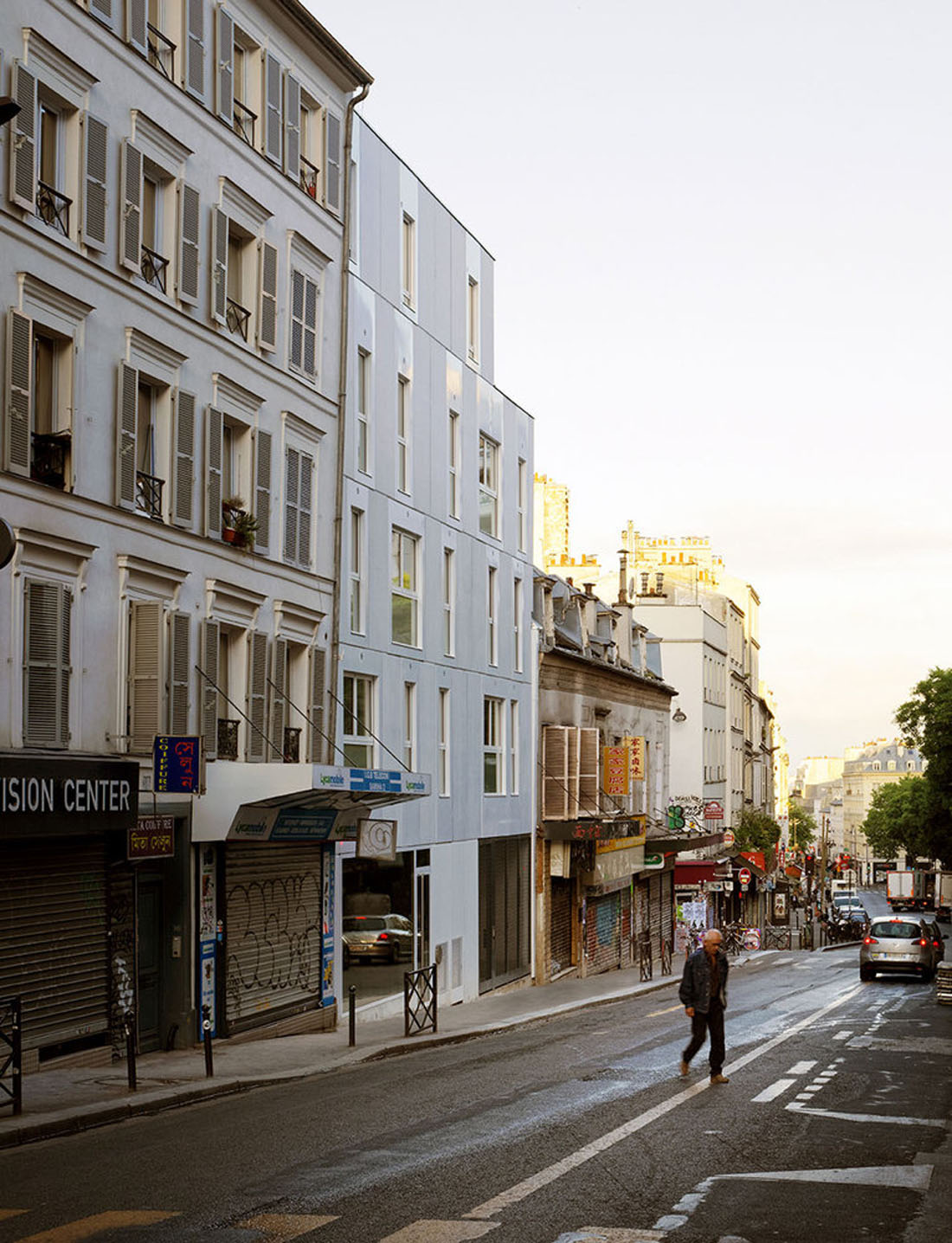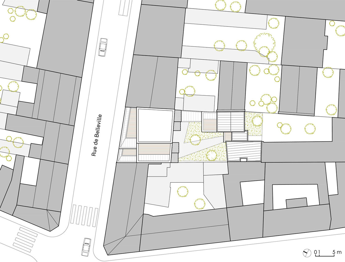 该项目由两栋建筑物组成,共有19个社会性公共住房单元,并在一楼设有商店。 贝尔维尔的城市结构由两个相交的系统组成:一方面是狭窄的繁忙道路,两旁是典型的“faubourg”式公寓楼,层层叠叠;另一方面,城市街区中心的空间非常狭窄,经常种上植物,垂直于斜坡的当地建筑两旁排列着。