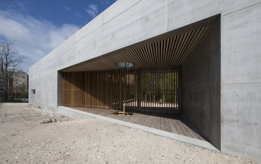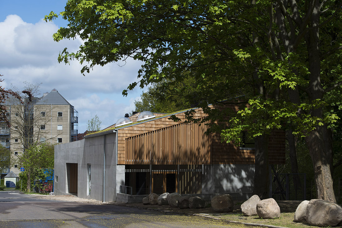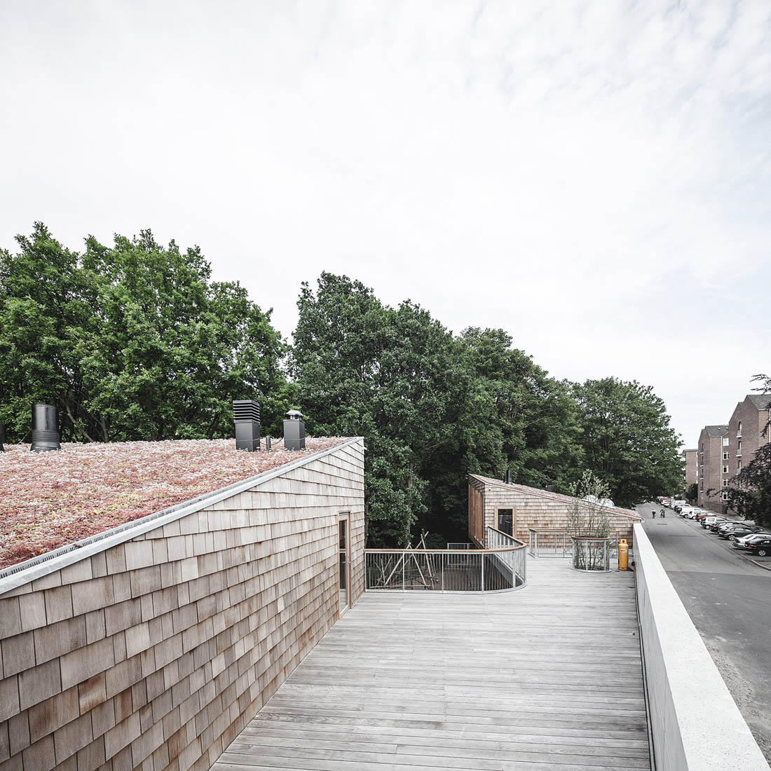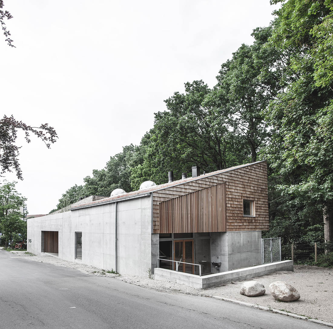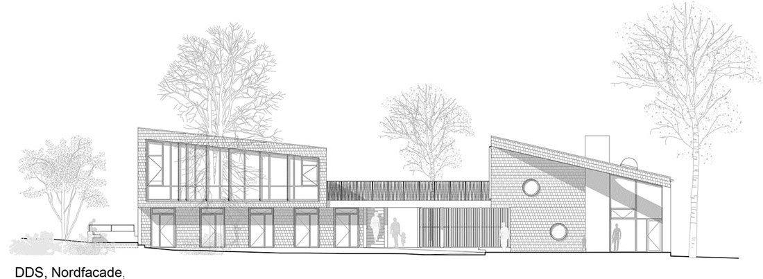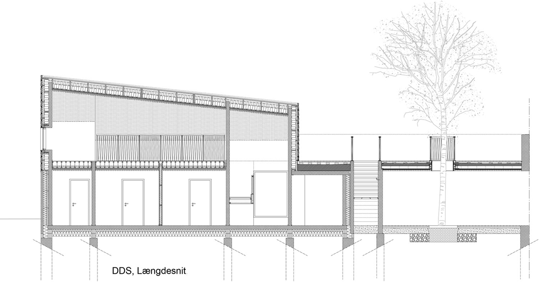 这座新的童子军营及社区公所位于哥本哈根Søndermarken公园的后方,基地沿着道路的走向呈长条形——它最窄处不超过10米,但东西方向的长度为80米,且有近3米的高差。Søndermarken公园中的大树,让这块基地拥有了更多特别之处。