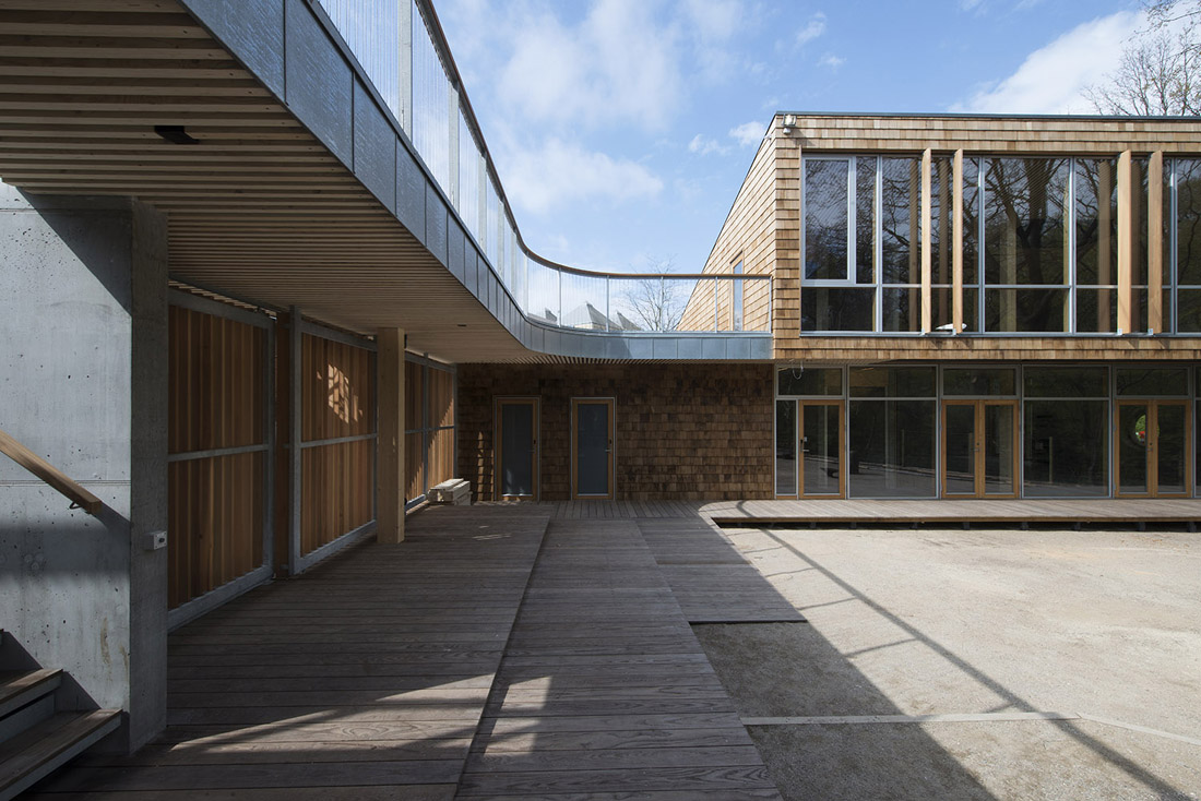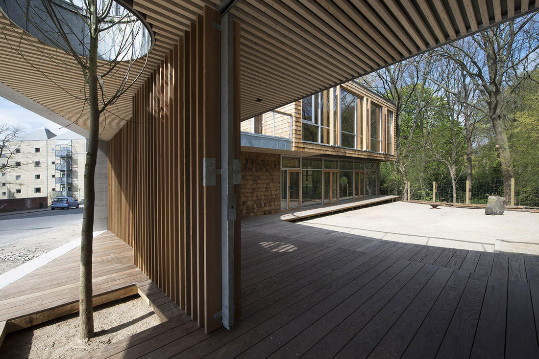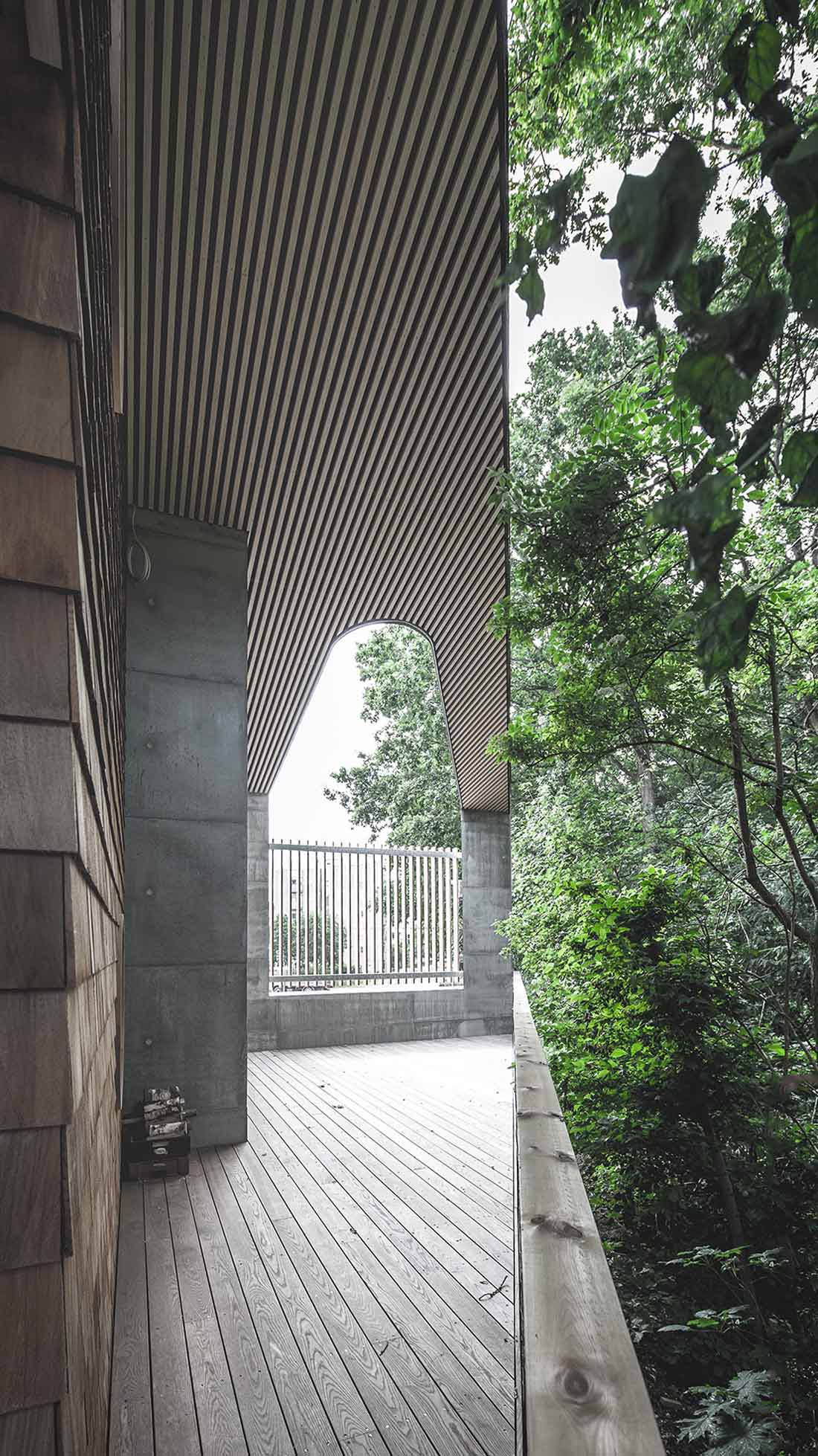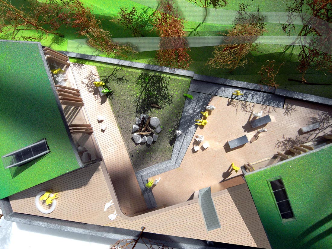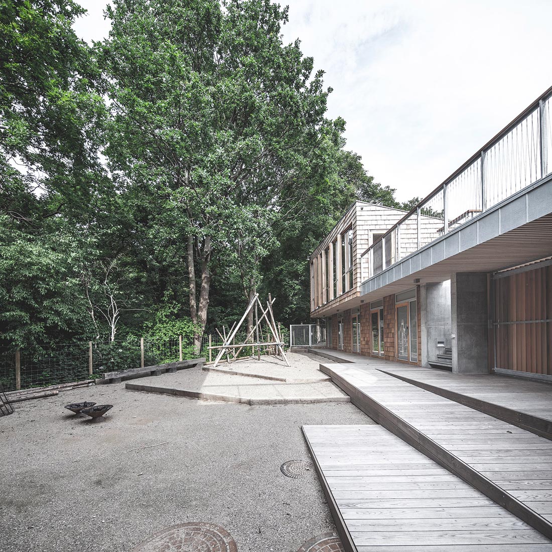 院子里的地面以木板和碎石子铺装。篝火区位于两栋建筑体量和树木围合出的区域的中心。室外空间在东西方向上有半米的高差,建筑师巧妙地利用这一特点设置了坡道和可以坐的台阶。建筑的三面都是公园的树木和灌木,营造出置身林间空地中的感觉。