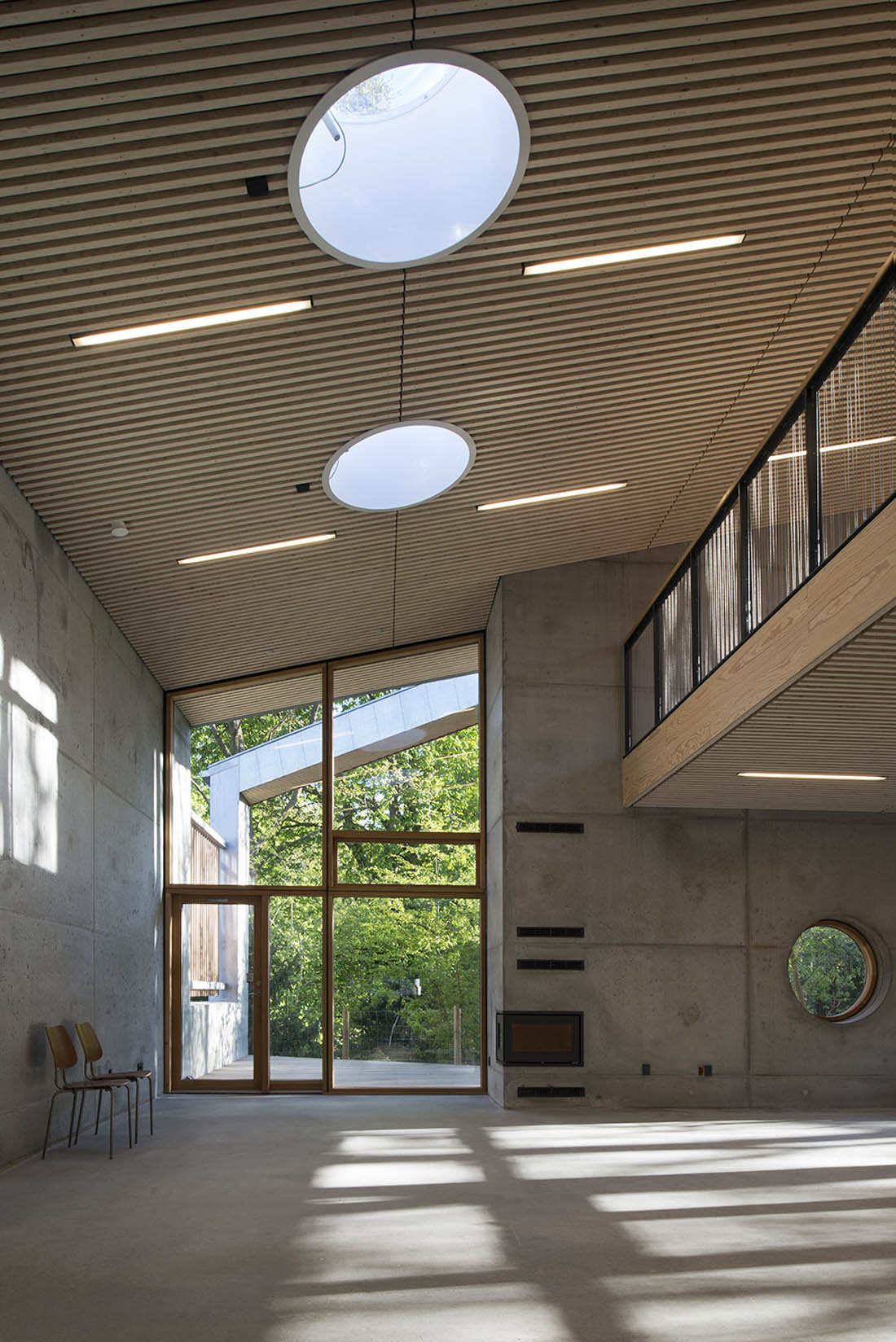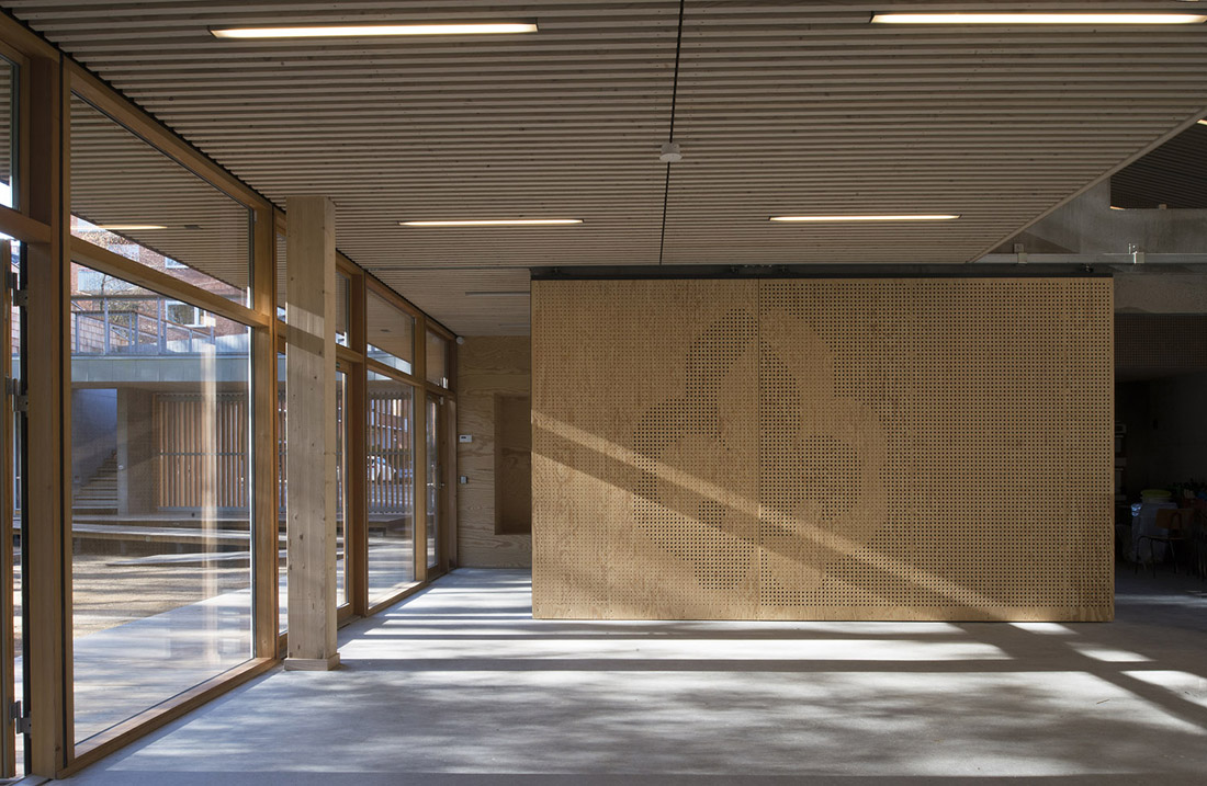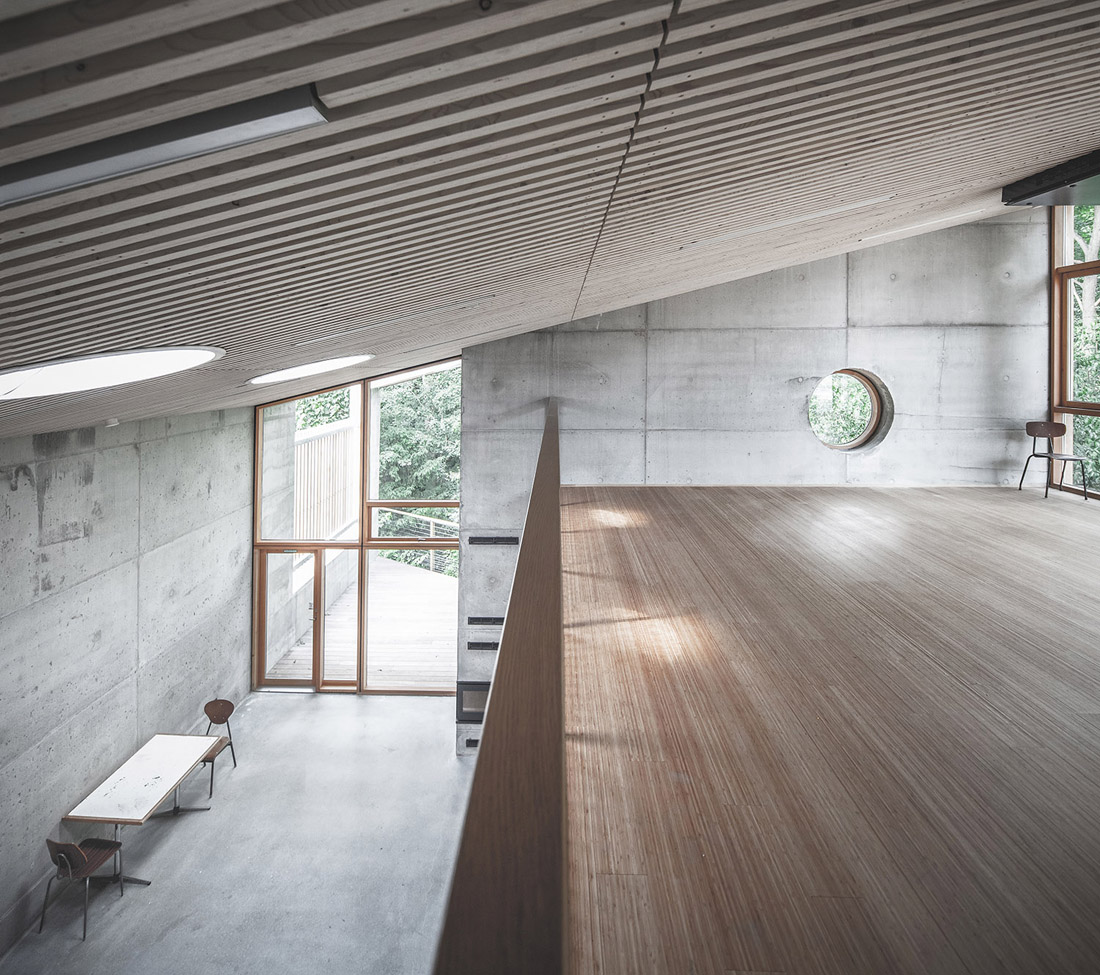 会议室位于房间的中心,与公园和室外的公共区域相连通,且面向庭院的立面可以大面积开敞,与露台连为一体,形成大面积的半开放空间。咖啡厅和厨房是开放的公共交流区。楼上的夹层同童子军营的夹层有所不同,它的天花板更高,适用于举行更加正式的活动。通过夹层可以直接前往南向的屋顶露台,且站在这里可以俯瞰整个地面层的空间。
