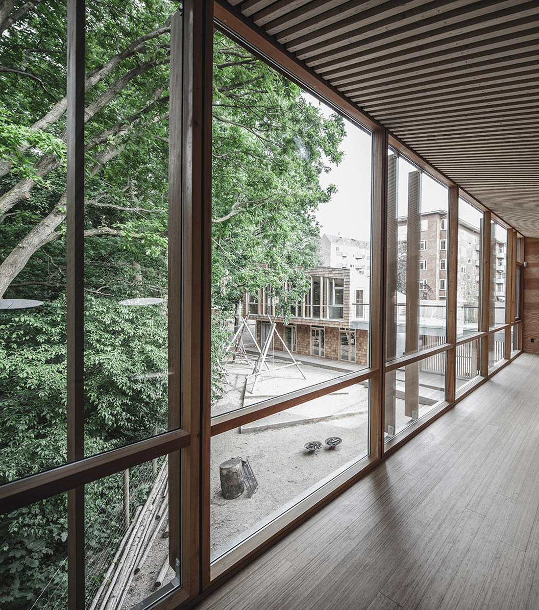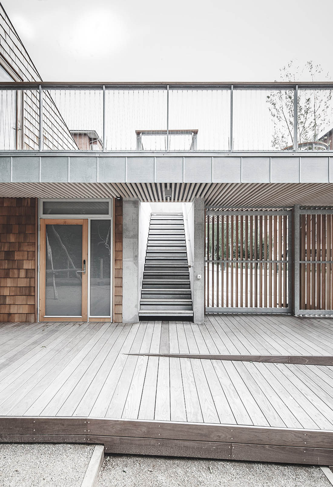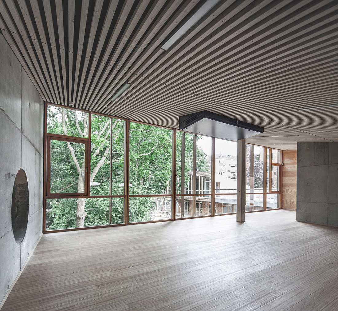 会议室位于房间的中心,与公园和室外的公共区域相连通,且面向庭院的立面可以大面积开敞,与露台连为一体,形成大面积的半开放空间。咖啡厅和厨房是开放的公共交流区。楼上的夹层同童子军营的夹层有所不同,它的天花板更高,适用于举行更加正式的活动。通过夹层可以直接前往南向的屋顶露台,且站在这里可以俯瞰整个地面层的空间。