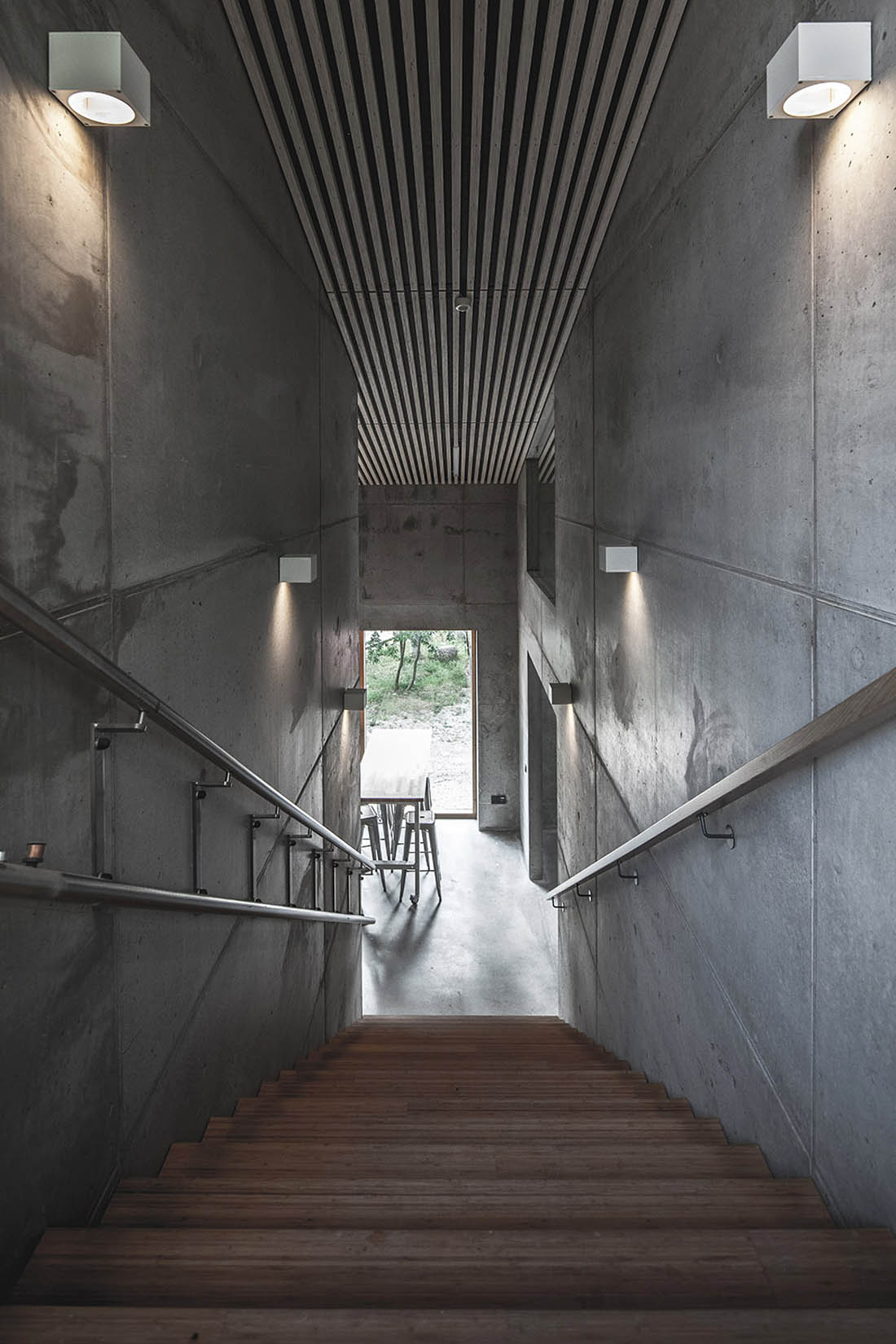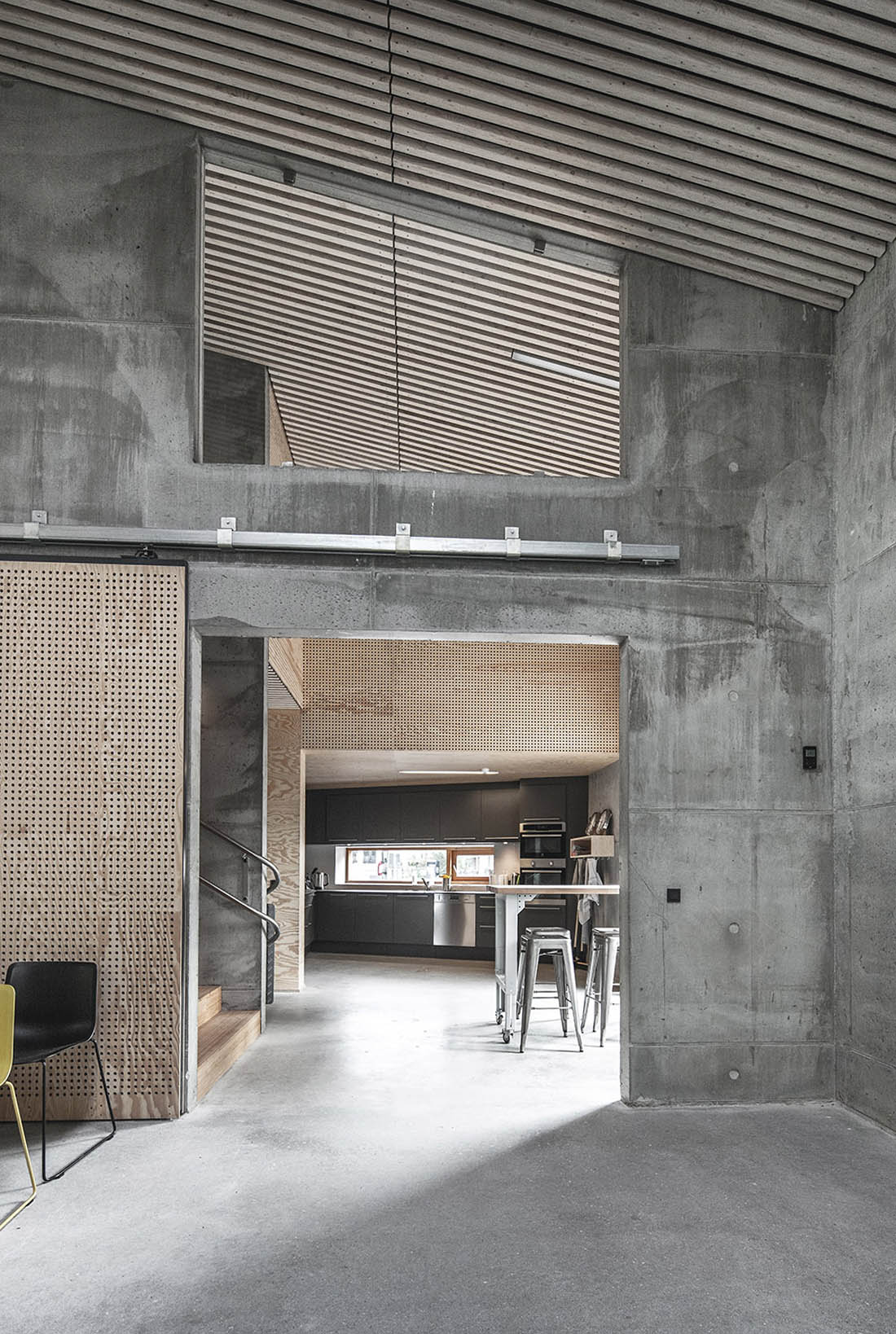 两个房间都有直接通往院子的出入口。工作间的山墙上有直接向下沉庭院开放的门,当打开的时候就成为既是室内又是室外的空间。