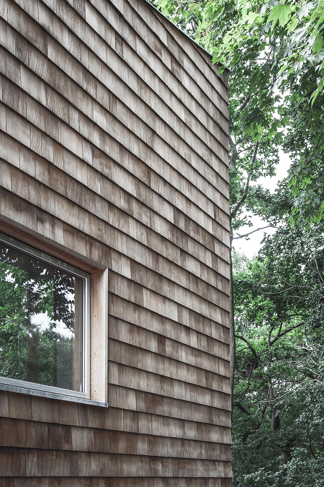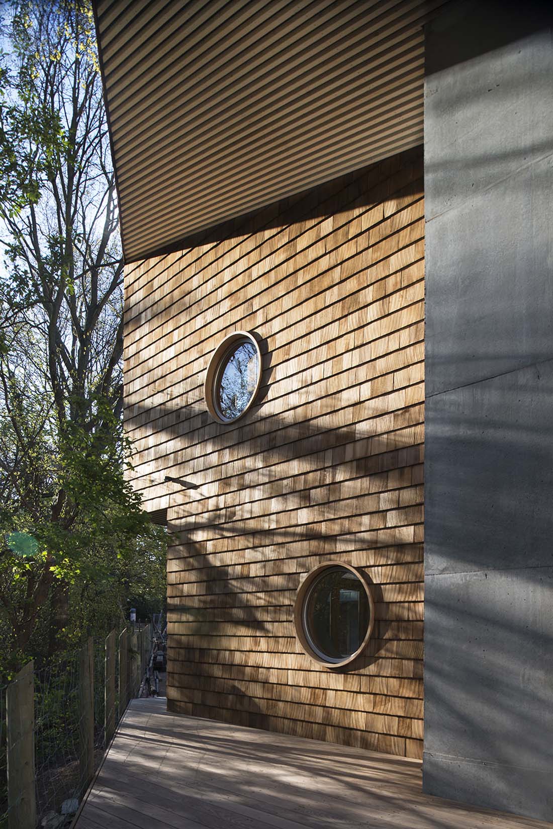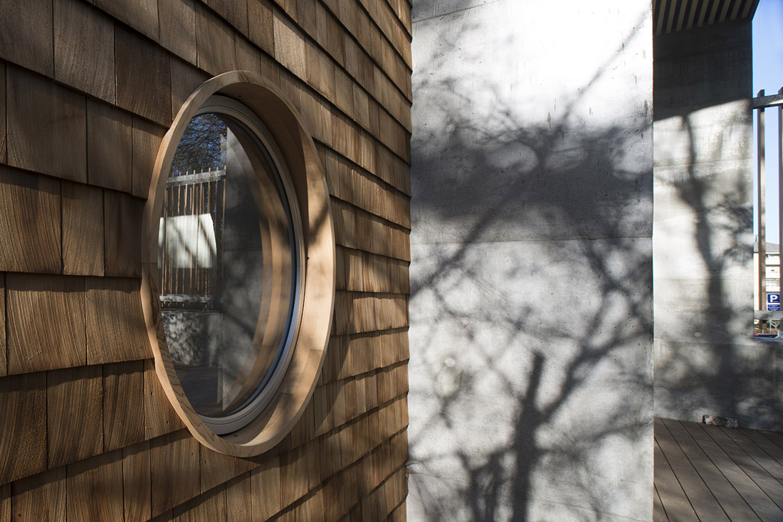 整个建筑外部的主要材料是现浇混凝土和加拿大雪松板。露台和屋顶平台使用的是碳化梣木。镀锌板和不锈钢用作部分构件的防护材料。下水管及水槽等构件使用的是锌材。