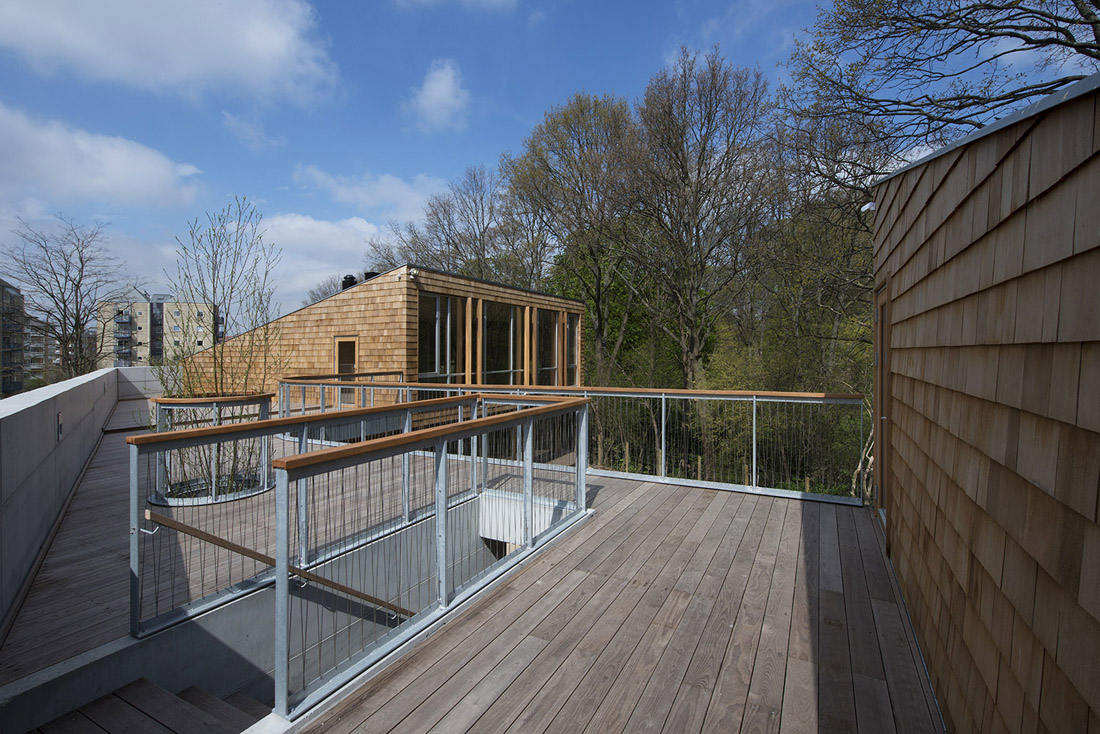巡逻室上方的夹层是为从其他地方来这里访问的童子军们准备的,夹层距离地面的高度恰好营造出住在树冠中的感觉。在建筑的尽头是由一间淋浴间和卫生间组成的套房。这个空间是为公园中的跑步的人准备的。