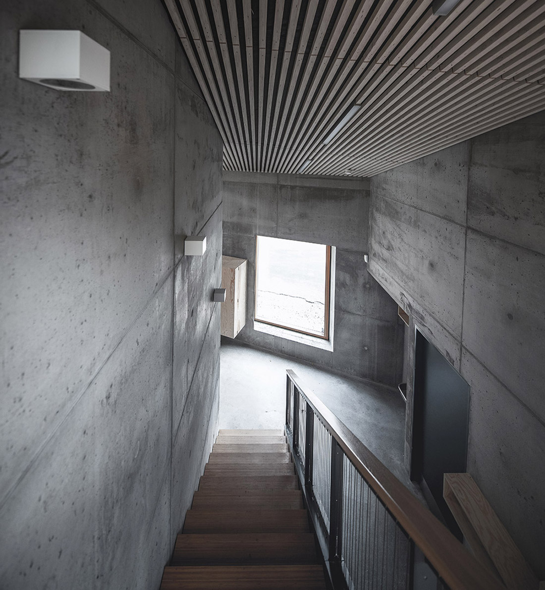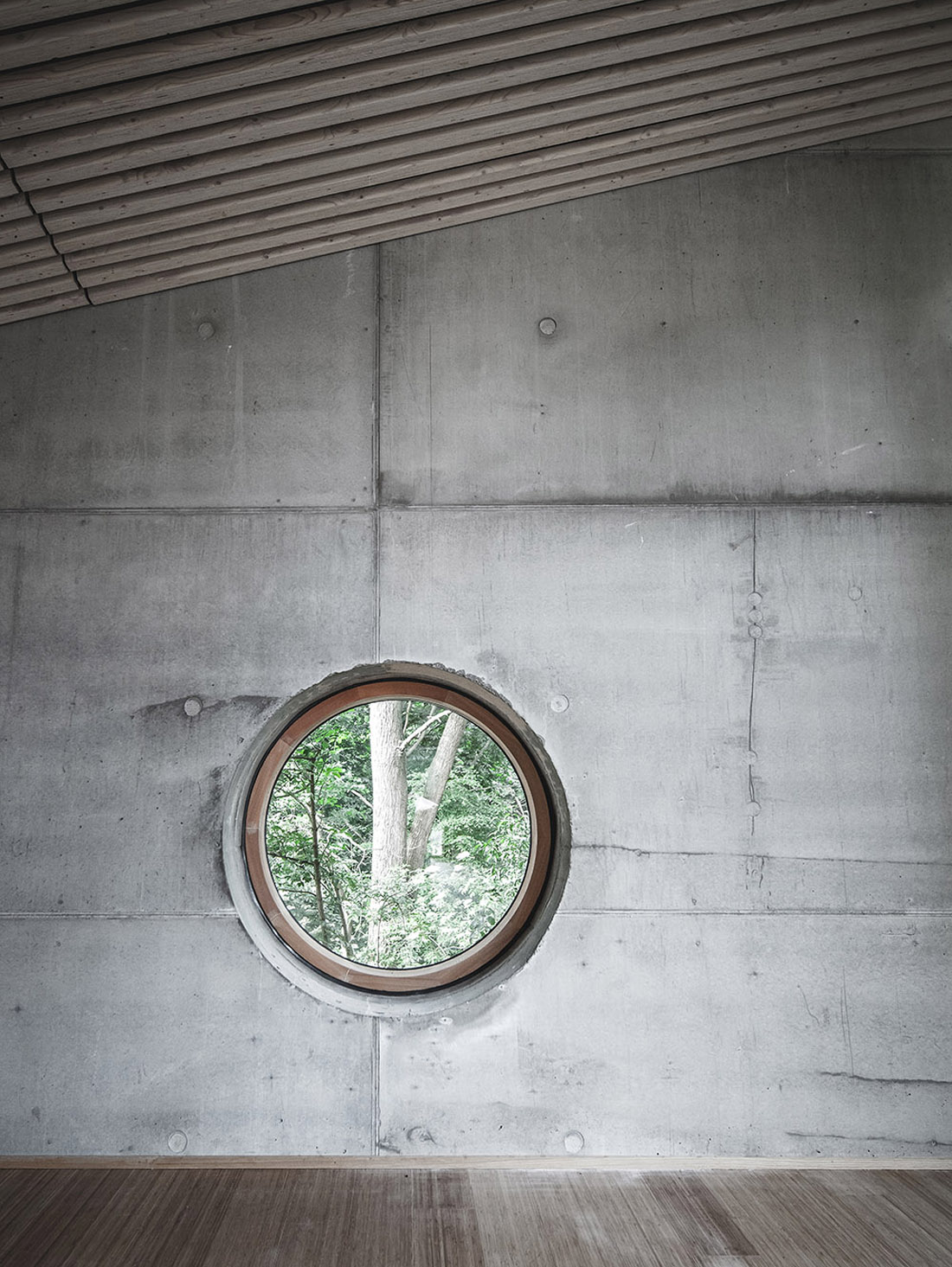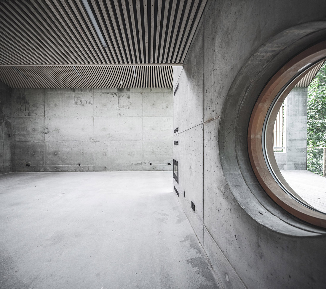 室内墙面的饰面由现浇混凝土和去皮的松木板构成,地板则是抛光的混凝土。夹层及室内楼梯使用的是竹制板材。厕所、仓库及技术用房的地面由工业涂料粉刷而成。天花板的材料是具有声学效用的LVL板条及松木板。窗框使用的是氧化铝覆面的松木条。