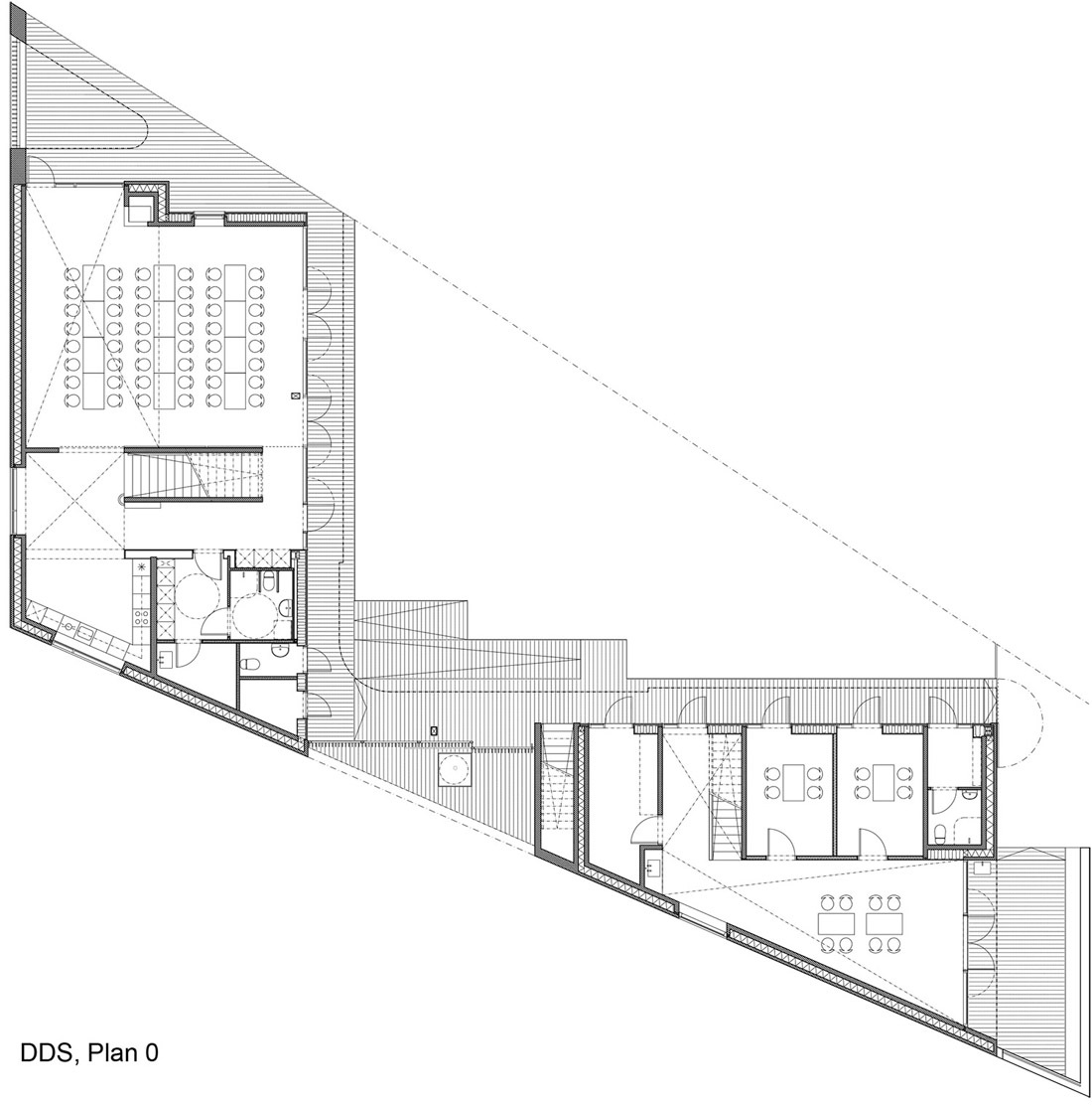 东侧的童子军营地由供童子军们使用的厕所及淋浴设备,还有两个小的巡逻间、一个大的工作坊及一个可以通往屋顶平台的夹层空间构成。每个巡逻间的面积有12㎡,配有桌椅和书柜。