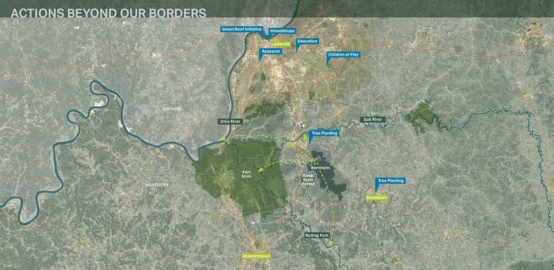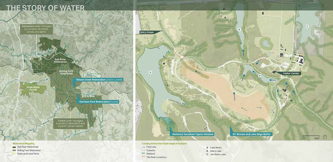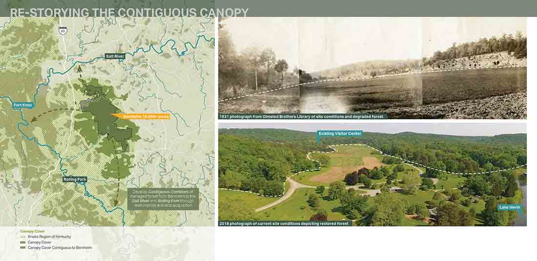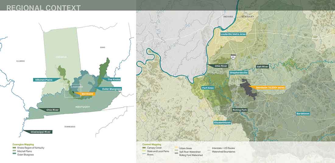 伯恩海姆植物园和研究林地坐落在肯塔基州路易斯维尔市以南30英里处,成立于1929年,其使命是在人与自然之间建立深厚的连接。植物园所在的场地最初由Olmsted兄弟担任规划,对遭到铁矿工业破坏的景观进行了长时间的修复并获得成功。占地15000英亩的植物园容纳了各类功能空间和景观元素,包括远足路径、教学设施、树种展示区和大型雕塑,以及占地14000英亩、由恢复后的山丘森林和溪流构成的生态系统。