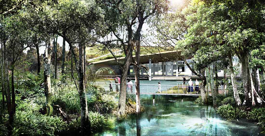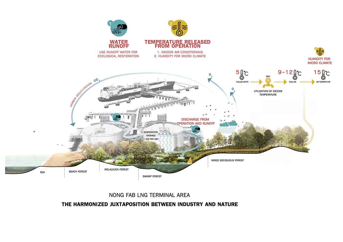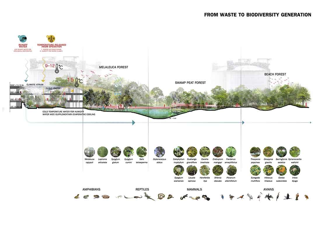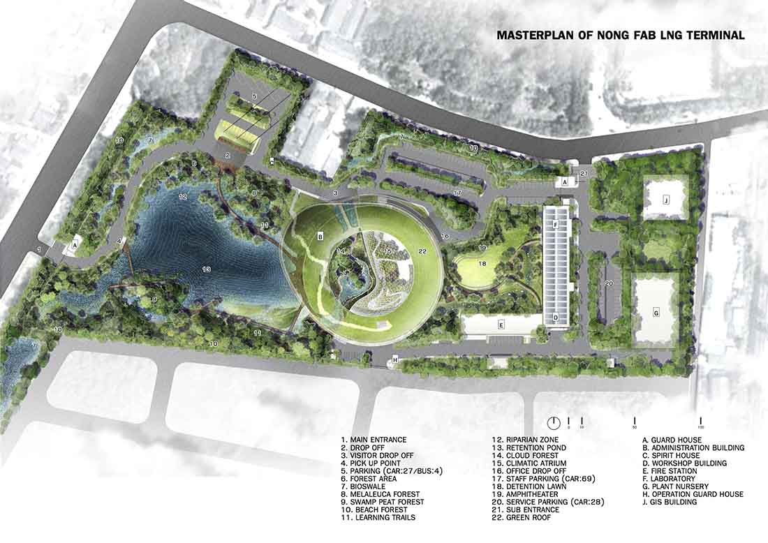“Nong Fab”是泰国的一个短语,意指带有丰富硬木灌木的沼泽地带,也称为“Fab”。新项目规划中的土地大部分被填平了,只留下很少的沼泽地区,几乎算不上Fab。从项目一开始,就致力于逆转这一过程,研究历史遥感数据,寻找优化现有自然排水系统的方法,恢复受损的沼泽,重新引入Fab并实施全面的再造林计划。因此,该项目将在200种本地植物中重新引入濒危的本地植被,再根据其与场地环境条件和预期用途的适应性进行最佳选择,培育森林和生态系统。