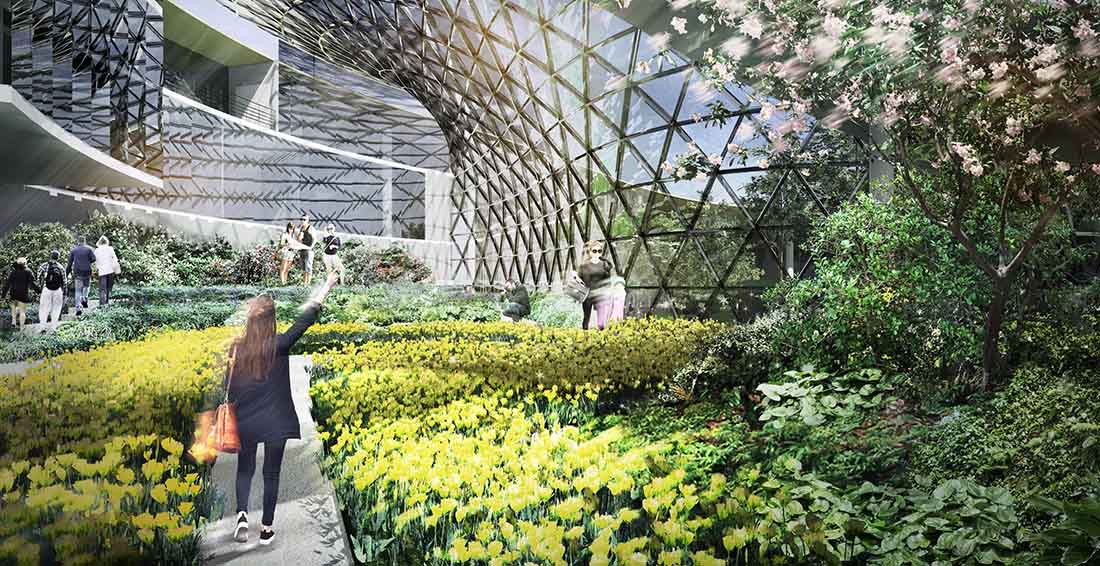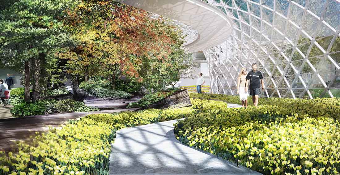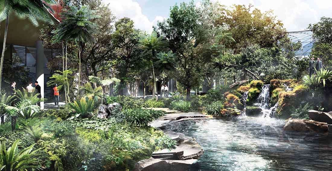 云雾森林几乎容纳了整个场地的水源。它将利用作业区的冷空气,控制室内温度,使其比室外的露天温度更低,由此形成不同的气候和栖息地。该森林以瀑布为特色,雾气和潮湿的环境将促进蕨类植物和苔藓的生长,并为所有用户创造一个舒适的氛围。
